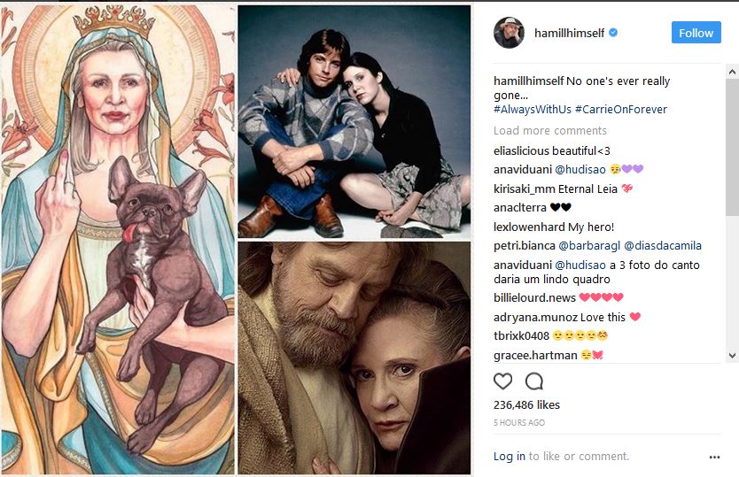 Terkait hal ini teman "seperjuangan" Fisher dalam film Star Wars, Mark Hamill mencurahkan isi harinya melalui akun Instagram pribadinya. Hamill memposting foto dirinya bersama Fisher saat keduanya masih muda dan setelah tua.