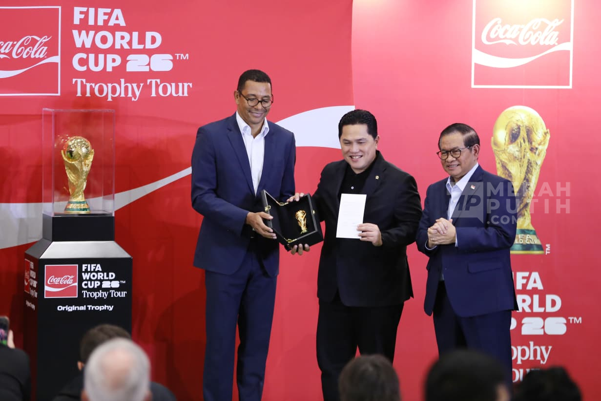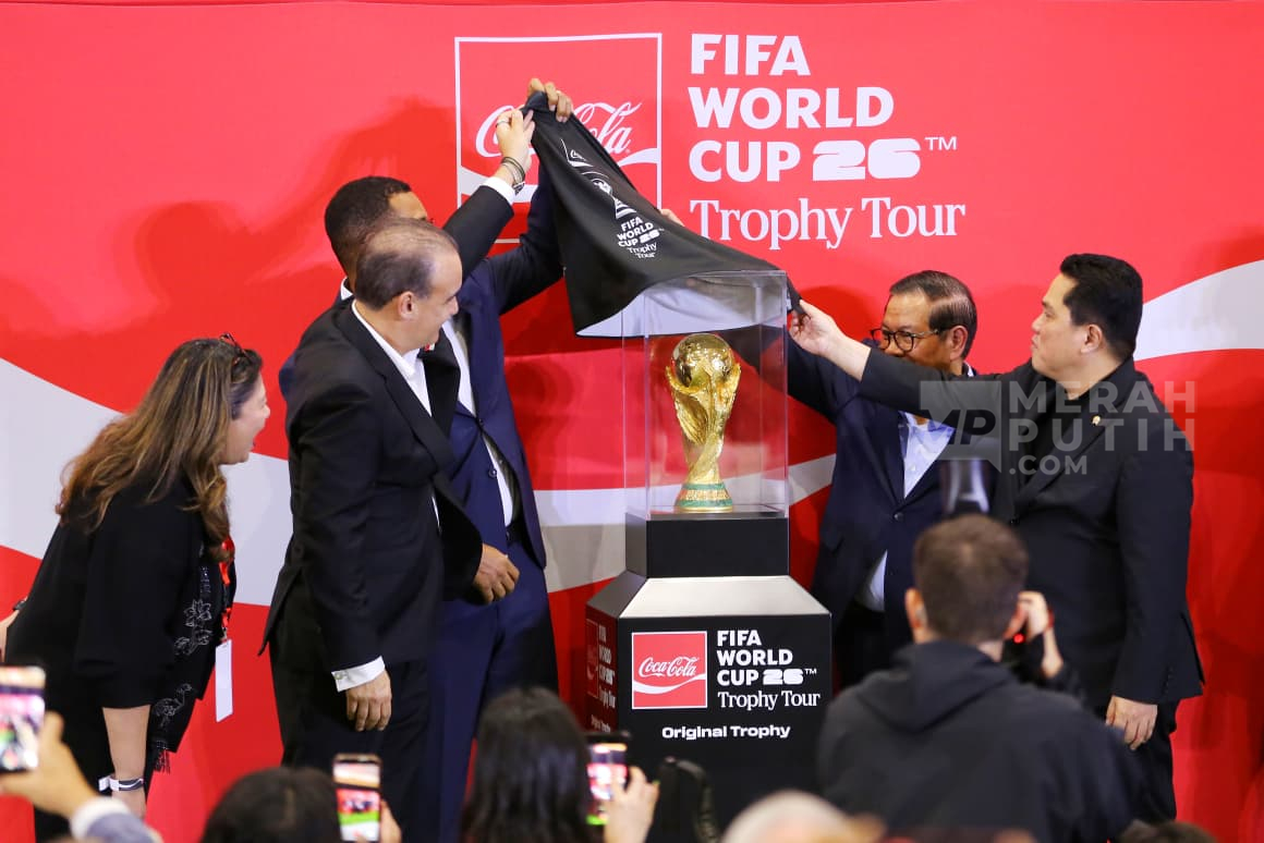 Merahputih.com - Menpora Erick Thohir bersama Gubernur DKI Jakarta Pramono Anung, President ASEAN & South Pacific The Coca-Cola Company Selman Careaga dan Legenda Sepak Bola Brazil Gilberto Silva membuka trofi FIFA World Cup 2026 yang dipamerkan di Jakarta International Convention Center (JICC), Senayan, Jakarta, Kamis (22/1/2026).