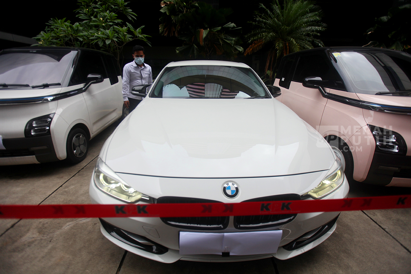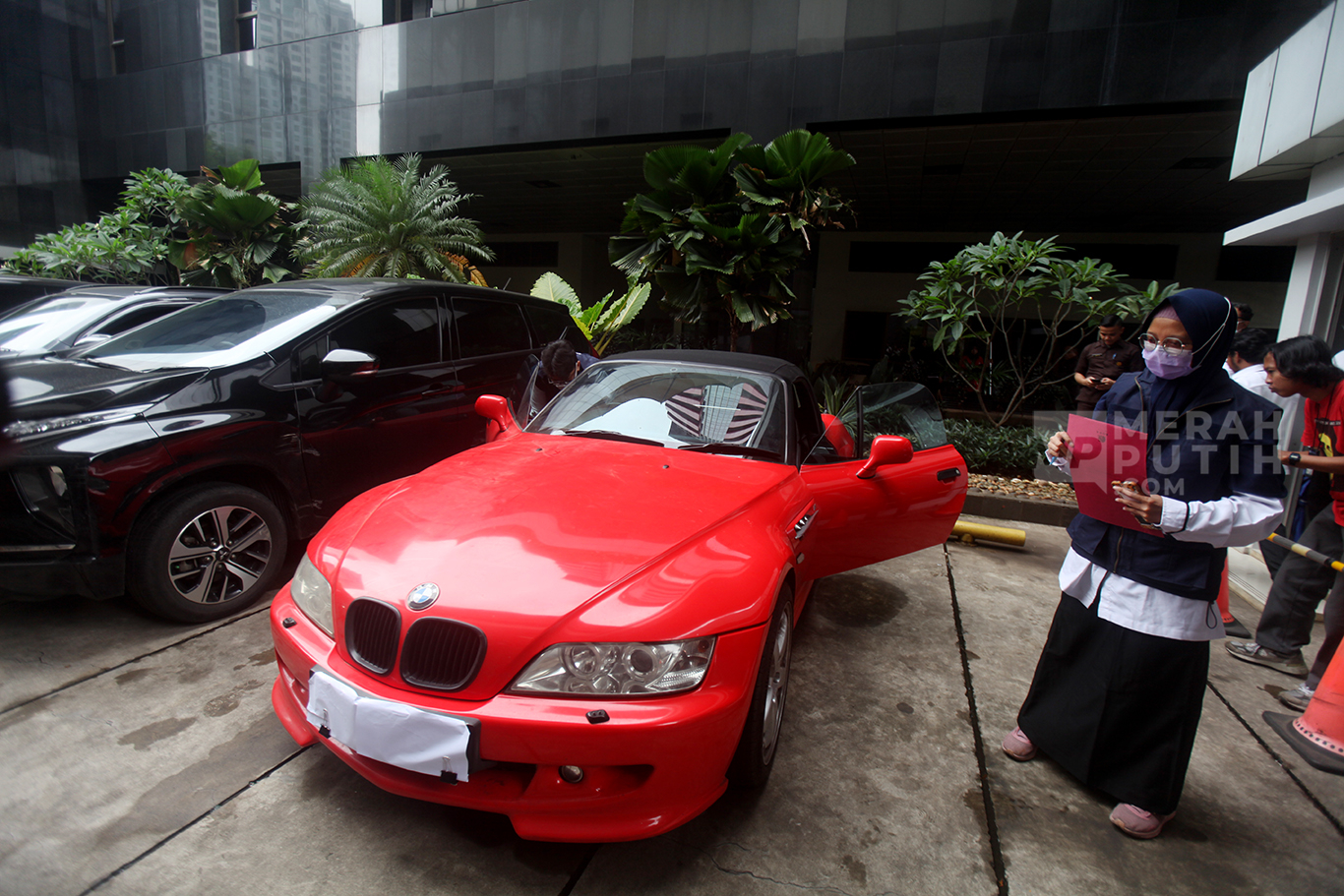 Merahputih.com - Petugas melakukan pengecekan barang sitaan Mobil BMW Type 3201 Putih kasus perkara Kemenaker di Gedung Merah Putih KPK, Kuningan, Jakarta, Senin (26/5/2025).