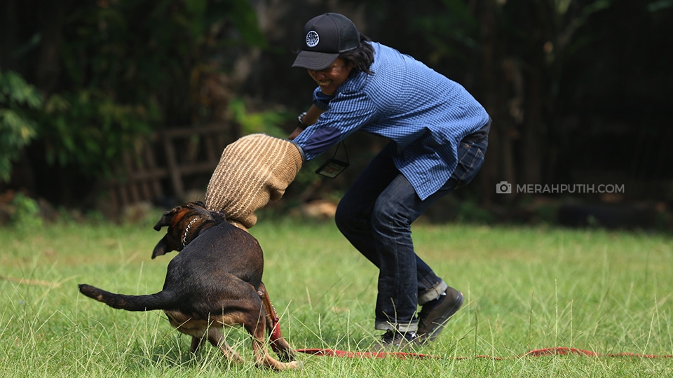 Seekor anjing jenis Belgian Malinois betina bernama Tina dari Unit K-9 tengah melakukan latihan pelacakan kriminal umum dengan menggigit hand protector objek yang dicurigai. Anjing pelacak kriminal umum bertugas membantu petugas kepolisian melacak keberadaan pelaku kriminal dengan menggunakan beberapa titik tolak berupa bau badan pelaku, barang yang ditinggalkan pelaku, dan barang yang sempat disentuh pelaku. Merahputih.com / Rizki Fitrianto