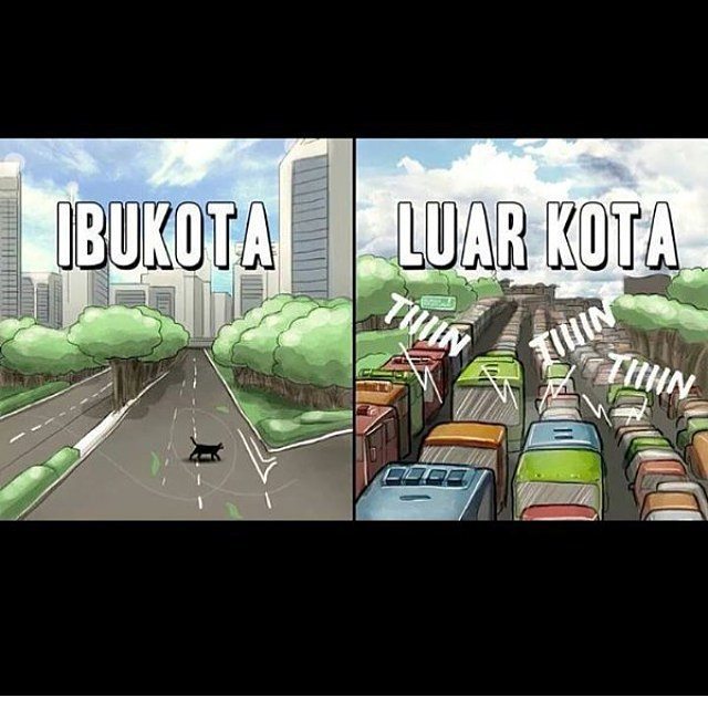 Meme suasana kota dan luar kota seperti gambar di atas mungkin kerap terjadi pada lebaran di tahun-tahun sebelumnya. Tetapi pada tahun ini seperti tidak terjadi, karena baik di kota maupun luar kota kondisi jalanan sama-sama sepi akibat pandemi virus corona.