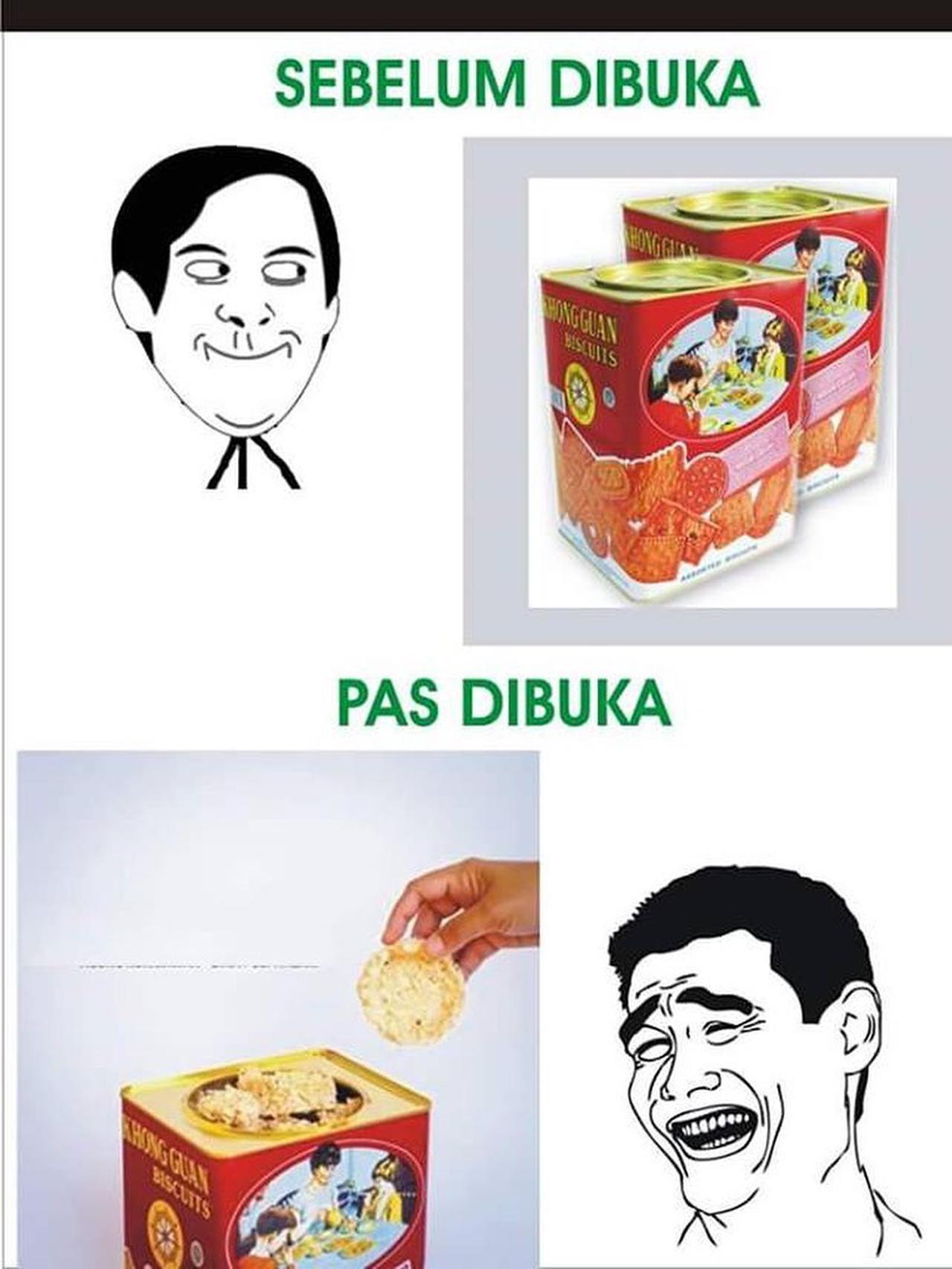 Meme di atas tentunya sudah sangat familiar bagi para masyarakat Indonesia. Jadi banyak orang yang deg-degan saat membuka isi kaleng biskuit khong guan tersebut. Alih-alih mendapat biskuit, justru rengginang yang di dapat. Mohon bersabar ya, ini ujian.
