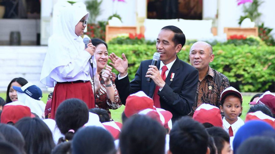 Seorang siswi Sekolah Dasar mendapatkan pertanyaan seputar dongeng cerita rakyat Nusantara dari Presiden Joko Widodo.