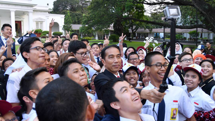 Presiden Joko Widodo dan Duta Baca Nasional Najwa Shihab melakukan swafoto bersama sejumlah siswa-siswi yang hadir dalam peringatan Hari Buku Nasional bertemakan 'Gemar Membaca' di halaman tengah Istana Kepresidenan Jakarta.