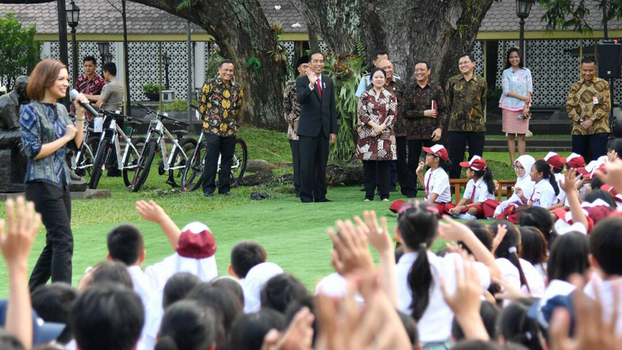Seperti dilain kesempatan, setelah berdongeng Presiden Joko Widodo memberikan sejumlah pertanyaan kepada siswa-siswi SD dan SMP yang turut hadir dengan hadiah sepeda.