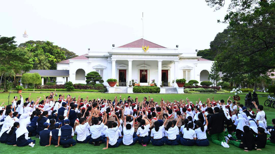 Sebanyak 503 siswa-siswi SD dan SMP duduk bersila di atas karpet hijau yang terhampar di atas rumput halaman tengah Istana Kepresidenan Jakarta, Rabu, (17/5). Kehadiran mereka untuk memenuhi undangan Presiden Joko Widodo yang sedang menggelar peringatan Hari Buku Nasional bertemakan 'Gemar Membaca'. Foto: Laily Rachev - Biro Pers Setpres