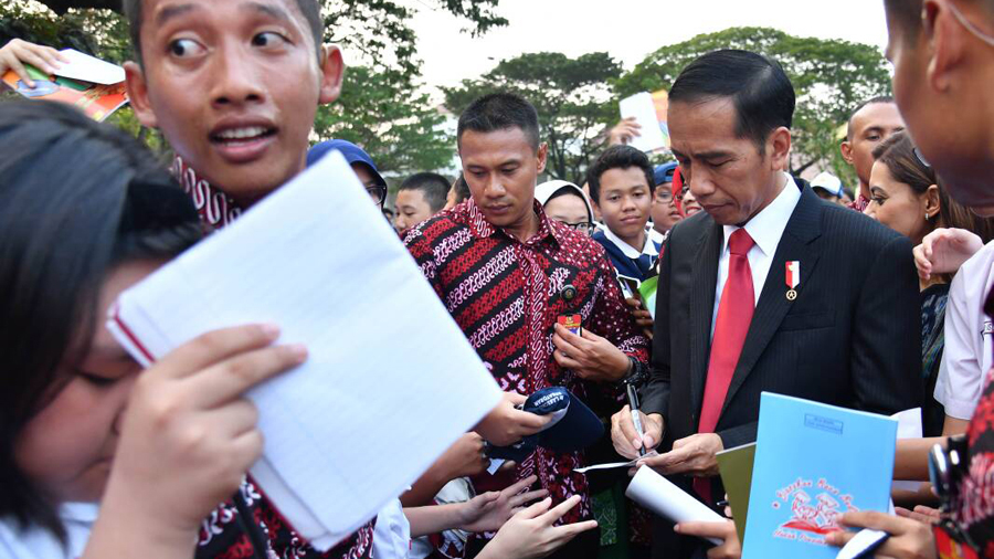 Setelah acara usai, Para siswa-siswi SD dan SMP berebut untuk meminta tanda tangan Presiden Joko Widodo sebagai bentuk kenang-kenangan.