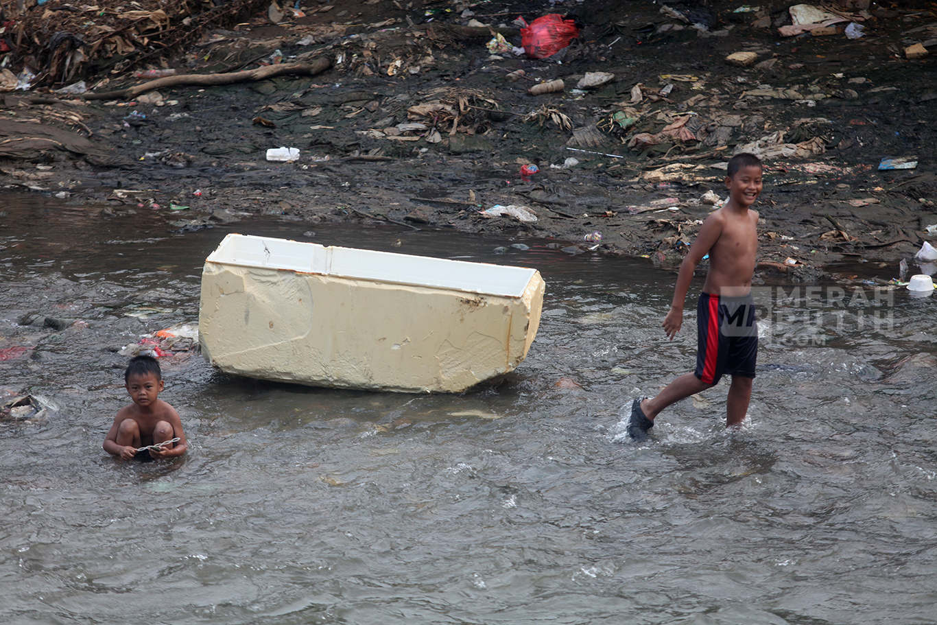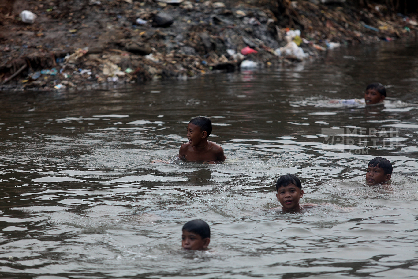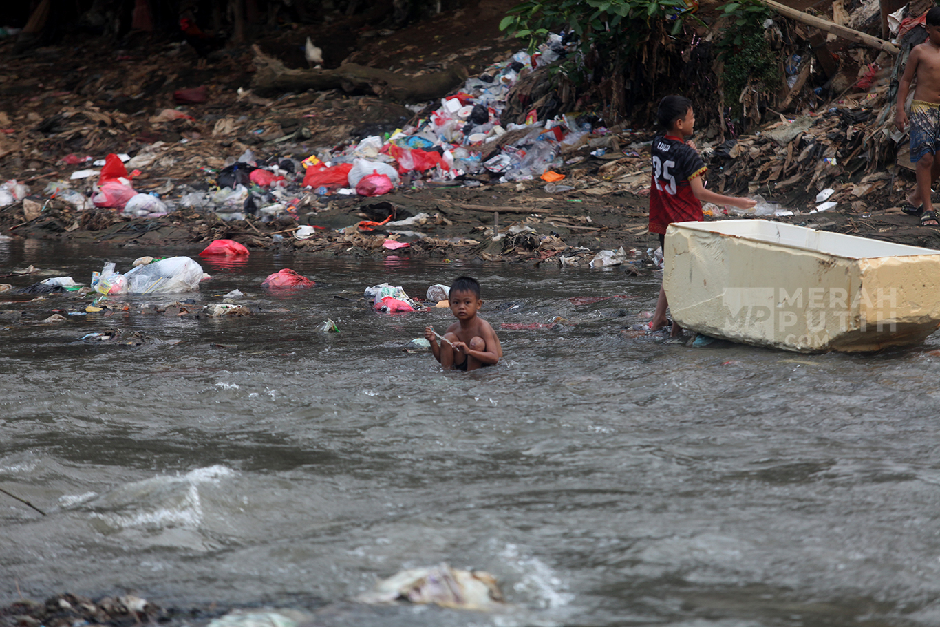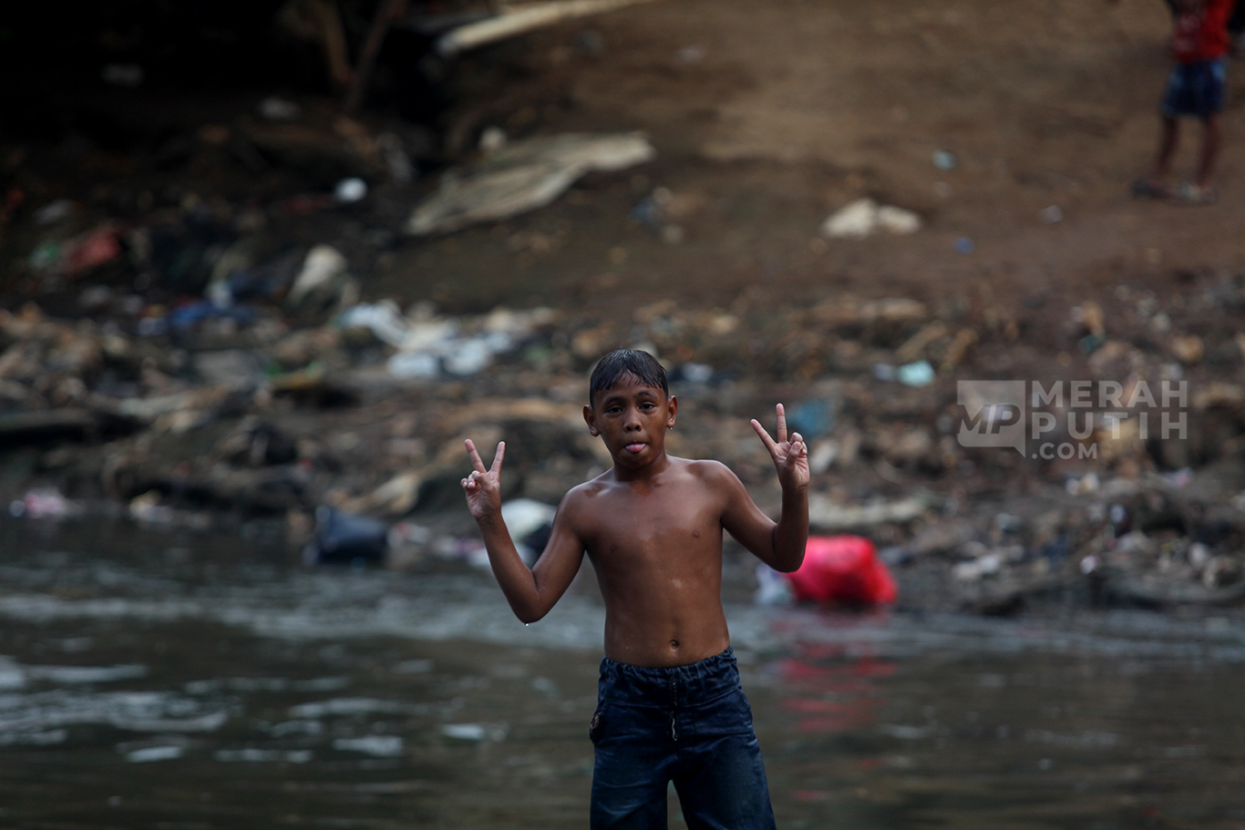 Sejumlah anak berenang dan bermain bersama di kali Ciliwin. Minimnya fasilitas bermain yang memadai di pemukiman penduduk, sehingga menyebabkan anak-anak bermain di lokasi yang berbahaya.