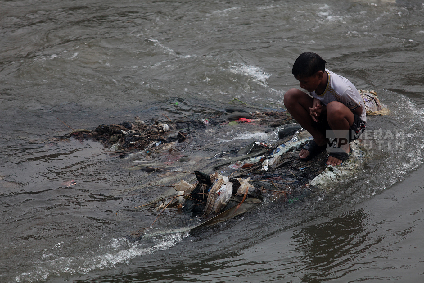 Merahputih.com - Anak-anak berenang di aliran sungai Ciliwung kawasan Manggarai, Jakarta Selatan, Jum'at (17/10/2025).