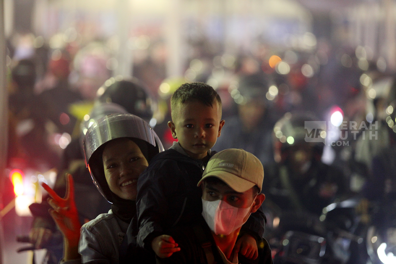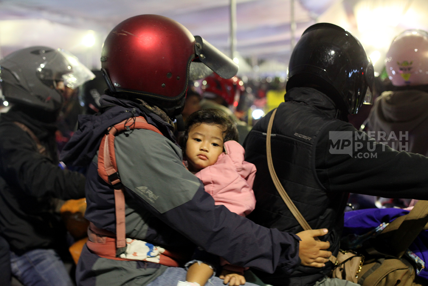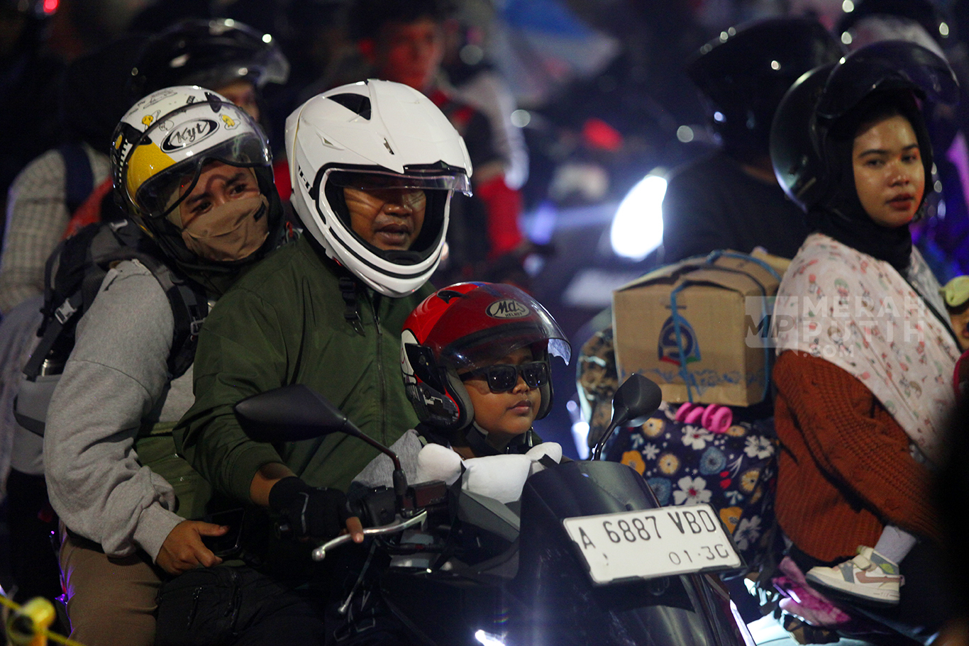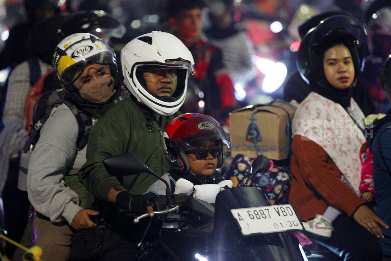 Dari ribuan pemudik motor dijumpai beberapa pemudik cilik yang ikut berbocengan dengan kedua ortang tuanya. mereka mendominasi bangku depan, dan bagian tengah motor. Pemudik cilik haru kuat dengan polusi udara sepeda motor, antrean ribuan motor hingga dinginnya angin malam. (MP/Didik Setiawan).
