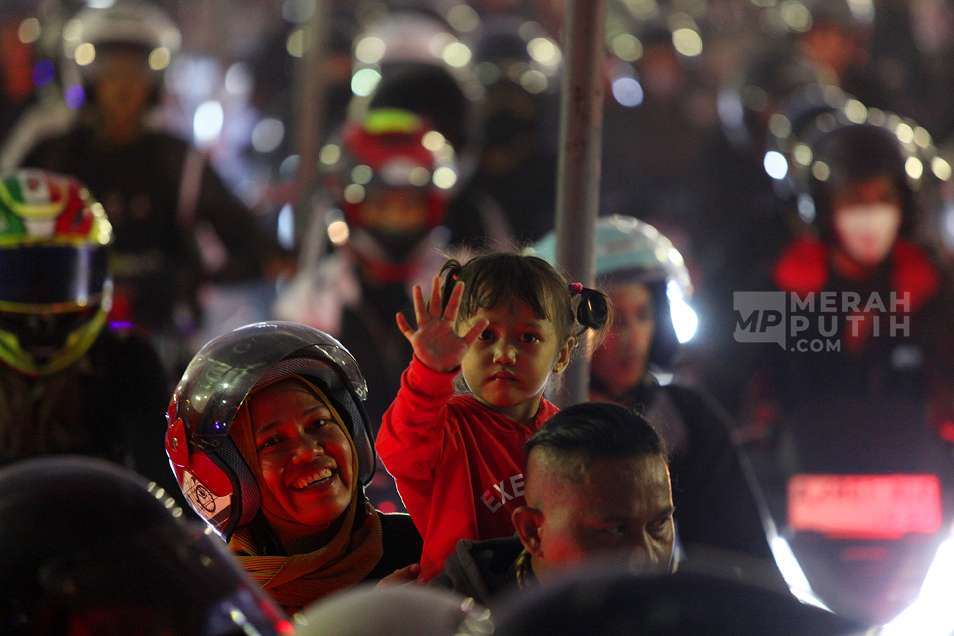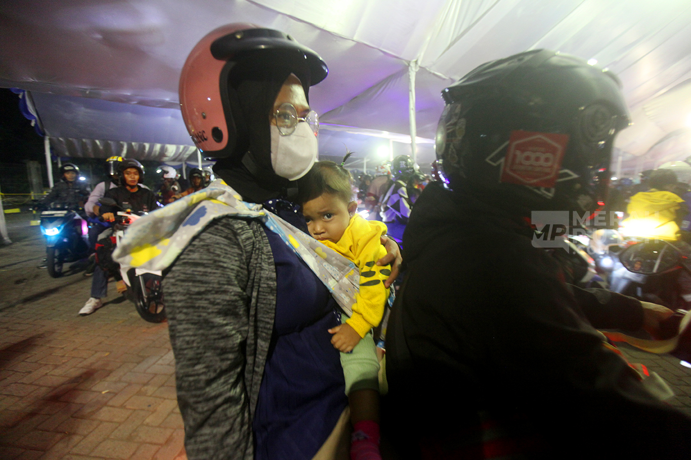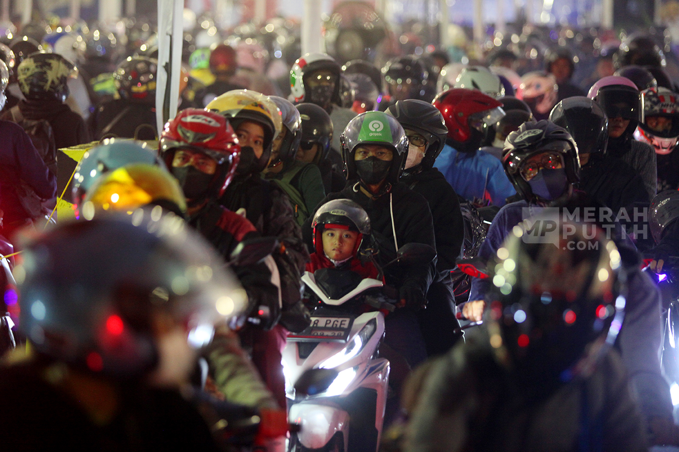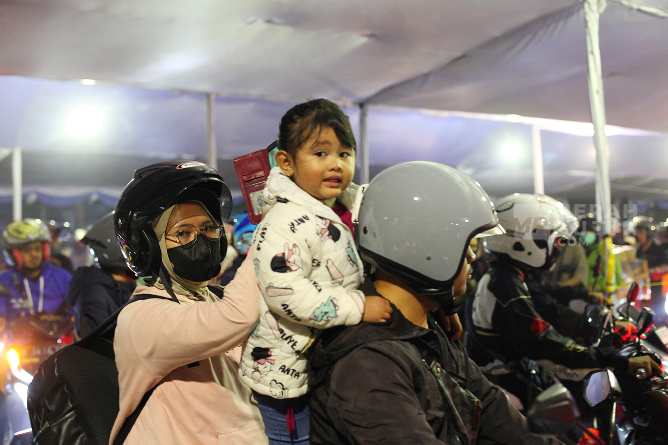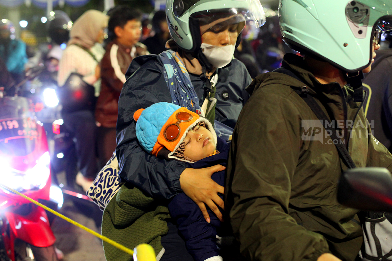 Dari ribuan pemudik motor dijumpai beberapa pemudik cilik yang ikut berbocengan dengan kedua ortang tuanya. mereka mendominasi bangku depan, dan bagian tengah motor. Pemudik cilik haru kuat dengan polusi udara sepeda motor, antrean ribuan motor hingga dinginnya angin malam. (MP/Didik Setiawan).