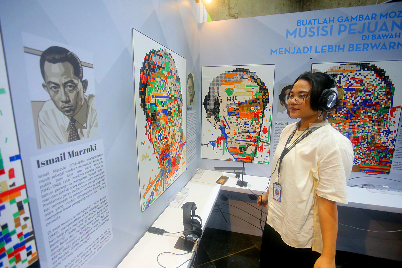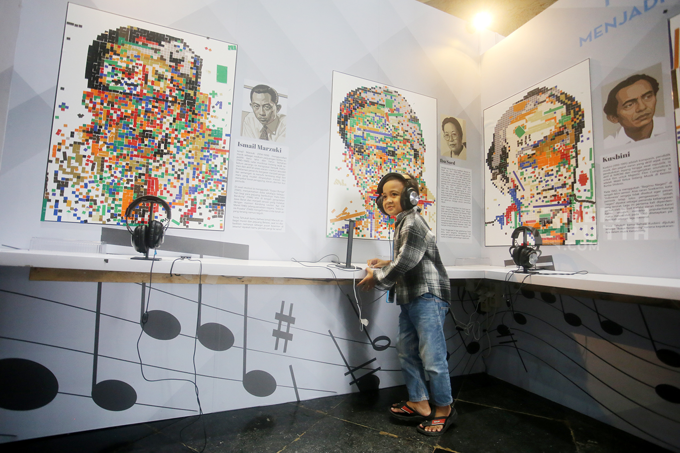 Pameran simfoni ini mengangkat peran musik dan seni sebagai bagian dari perjuangan menuju kemerdekaan Indonesia melalui karya seni rupa, instalasi interaktif, serta sajian audio visual bernuansa lagu-lagu perjuangan. Melalui pameran ini, pengunjung diajak merasakan atmosfer perjuangan secara imersif dengan menyaksikan video dan mendengarkan musik perjuangan yang menjadi medium pembangkit semangat nasionalisme di masa pergerakan. (Foto: MP/Didik Setiawan).