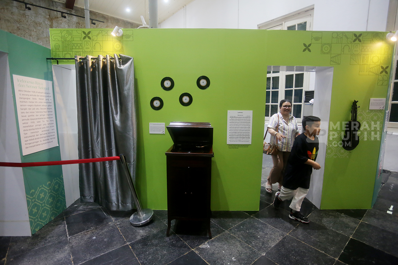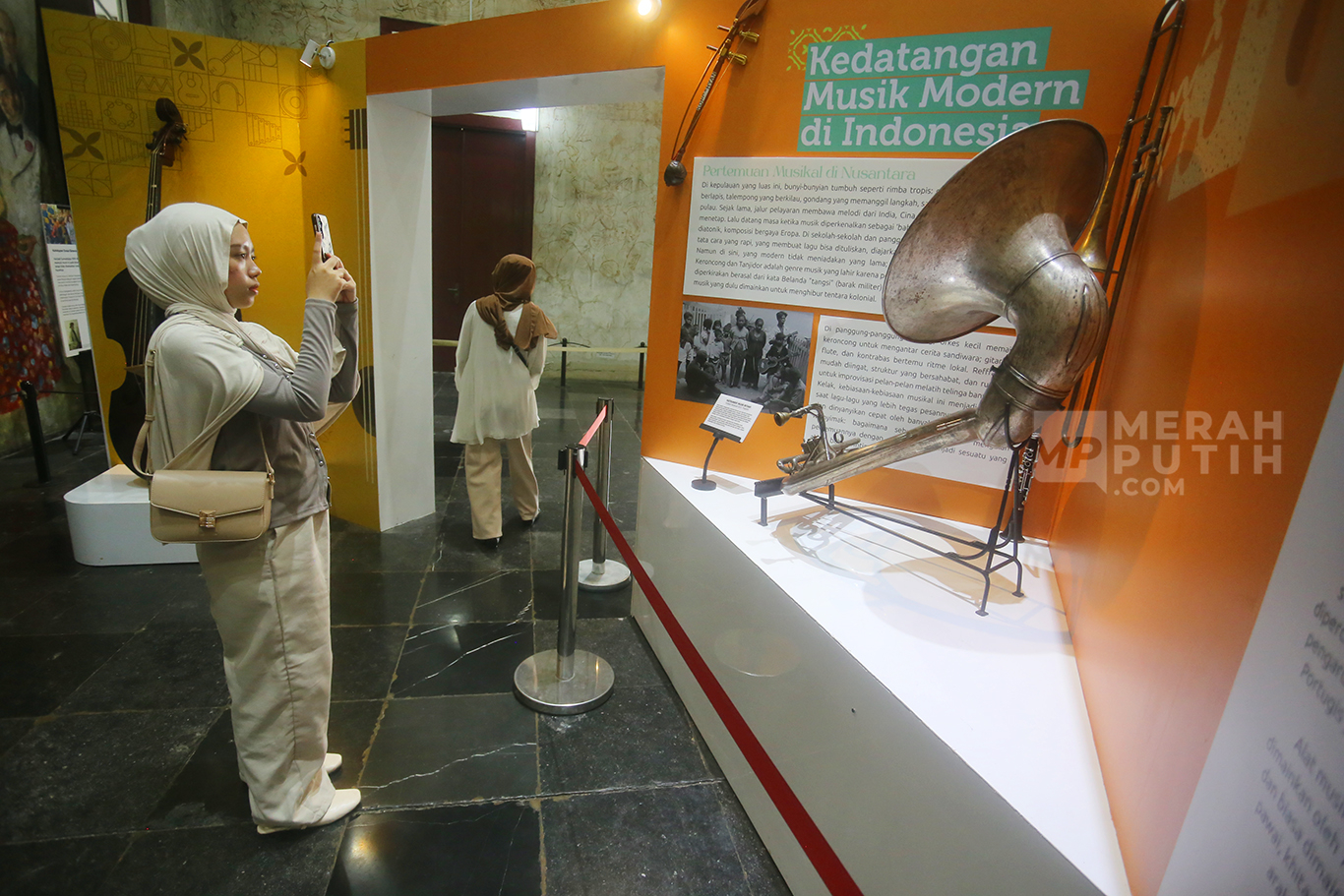 Merahputih.com - Pengunjung mendengarkan musik dalam pameran bertajuk Simfoni Perjuangan: Mengubah Derap di Masa Perjuangan di Museum Sejarah Jakarta, Taman Fatahillah, Kawasan Pinangsia, Taman Sari, Jakarta Barat, Jum'at (2/1/2026).