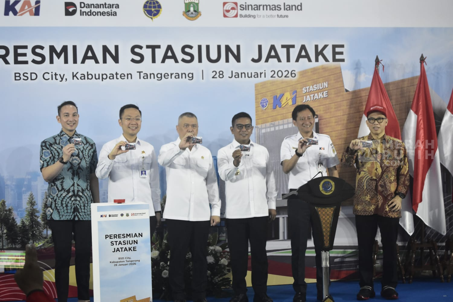 Merahputih.com - Menteri Perhubungan, Dudi Purwagandhi (keempat kanan) Gubernur Banten, Andra Sini (ketiga kanan) Direktur Utama PT Kerata Api Indonesia (Persero), Bobby Rasyadin (kedua kanan) Direktorat Jenderal Perkeretaapian, Allan Tandiono (kelima kanan) CEO Digital Tech Ecosystem and Development Sinar Mas Land, Irawan Harahap (keenam kanan) CEO Strategic Land Bank Sinar Mas Land, Christopher Siswanto Adisaputro (kanan) memencet tombol saat peresmian Stasiun Commuter Line Jatake, BSD City, Kabupaten Tangerang, Banten, Rabu (28/01/2026).