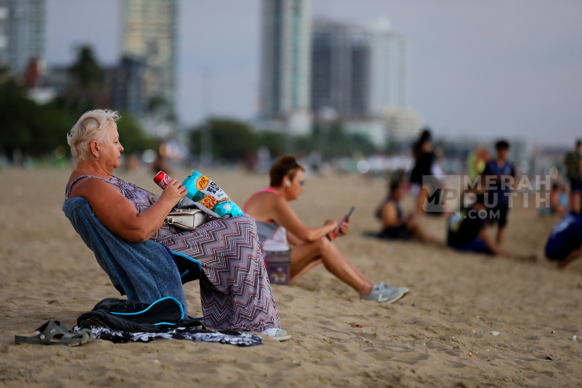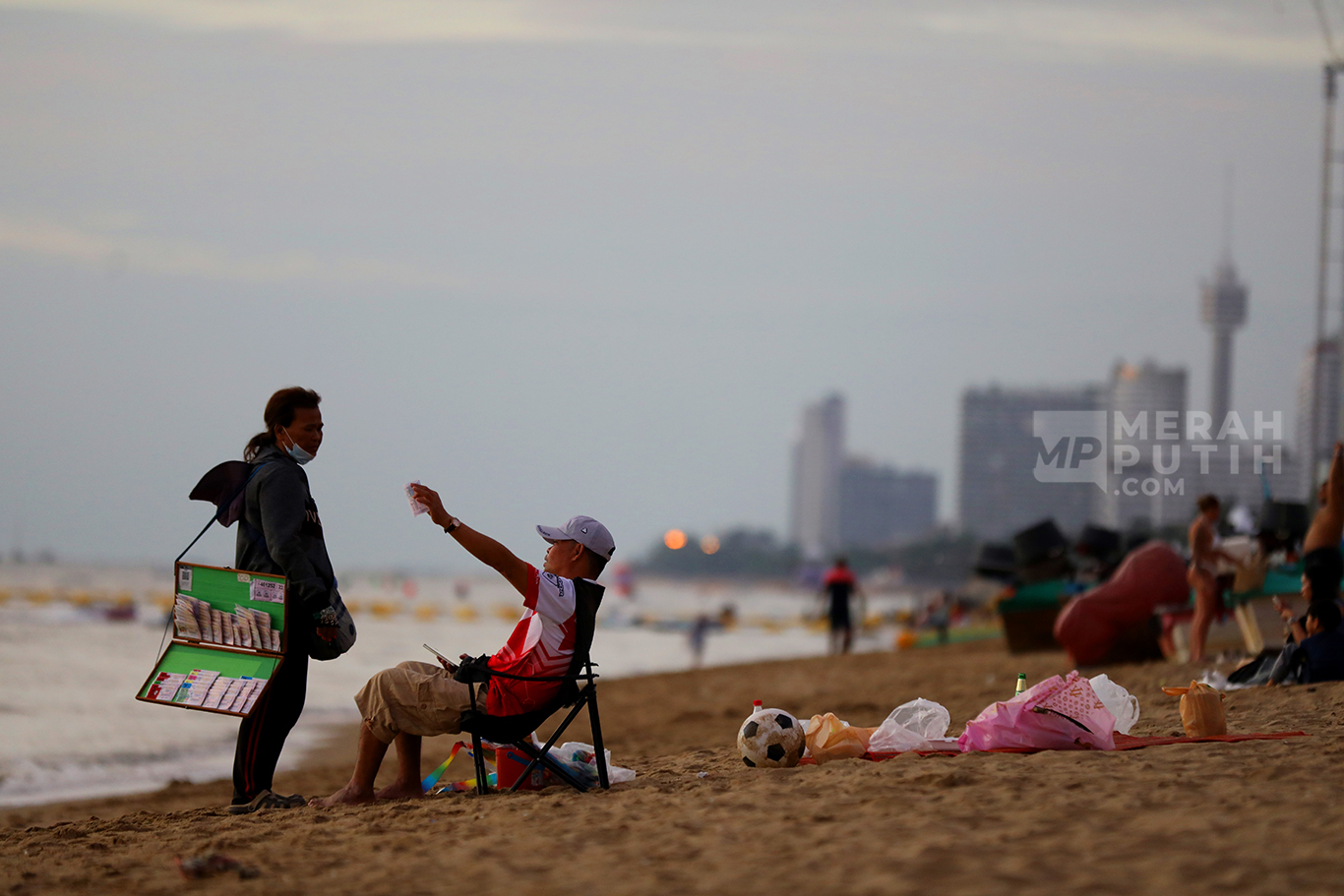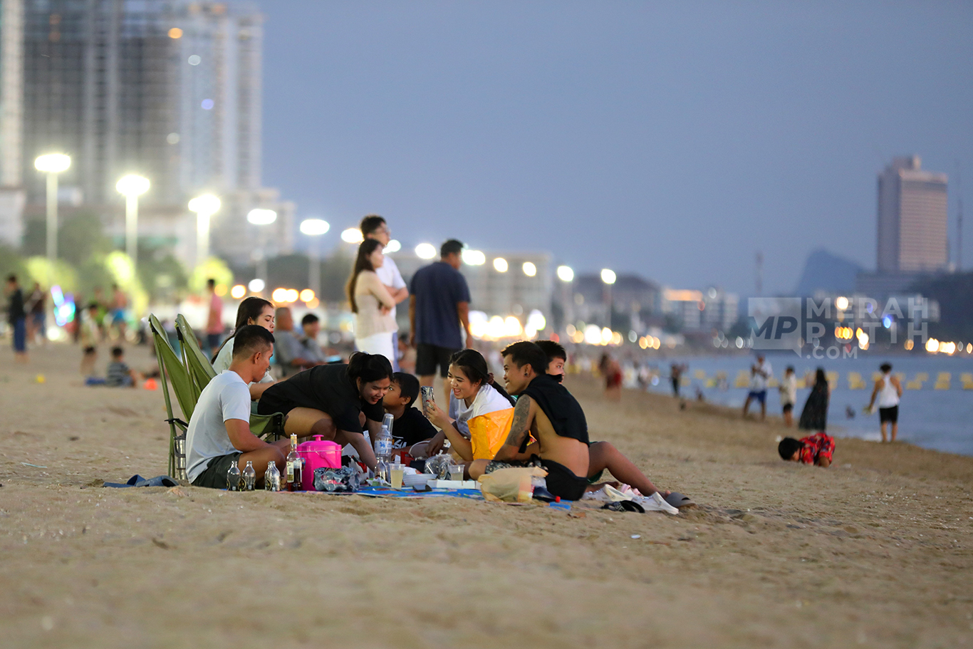 Merahputih.com - Suasana warga piknik bersama keluarga menikmati matahari terbenam di Pantai Pattaya, Chonburi, Thailand, Sabtu (20/12/2025).