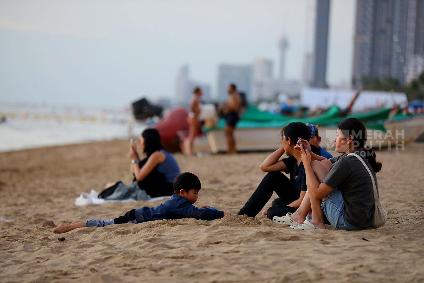 Pantai Pattaya menampilkan sisi lain kota yang kini semakin ramah keluarga. Di sepanjang pesisir, suasana ramai namun tertata menghadirkan ruang santai bagi wisatawan dan warga lokal. Pasir putih dipenuhi alas piknik, anak-anak bermain di tepi laut, sementara keluarga menikmati sore dengan latar laut biru dan angin pantai yang sejuk.