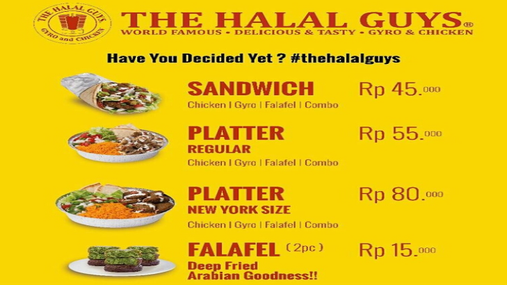 Jika porsi makan Anda besar, boleh lah pilih yang ukuran large di The Halal Guys, Senayan City, Jakarta. Nama resto ini tentu tak asing lagi, khususnya di kalangan foodies. The Halal Guys milik tiga orang Mesir. Pertama kali dibuka di New York, Amerika Serikat, pada 1990.