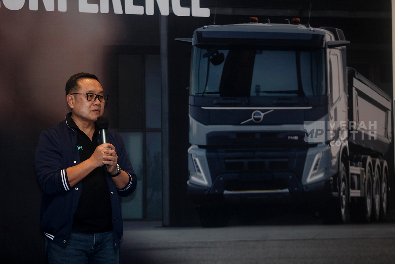 Presiden Direktur PT Wahana Inti Selaras Bambang Prijono, selaku importer dan distributor dari Volvo Trucks di Indonesia saat menyerahkan penghargaan pada pemenang Trucks Driver Challenge 2024-2025 Faturrohman dari PT Saptaindra Sejati untuk pemenang kategori Offroad dan Karly Irfan Pratama dari PT Bukit Asam Tbk (Penambangan).