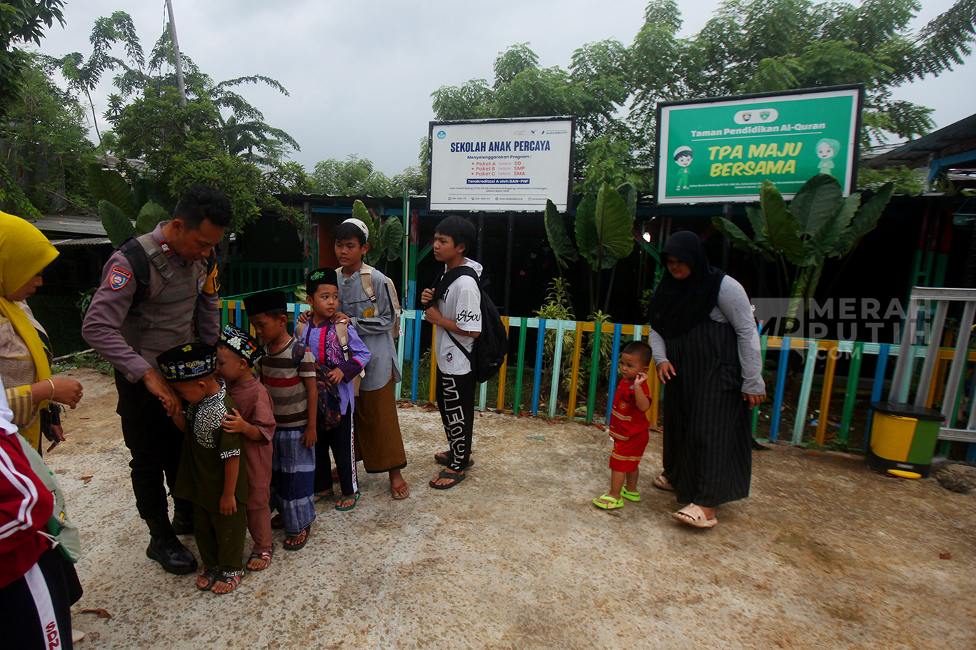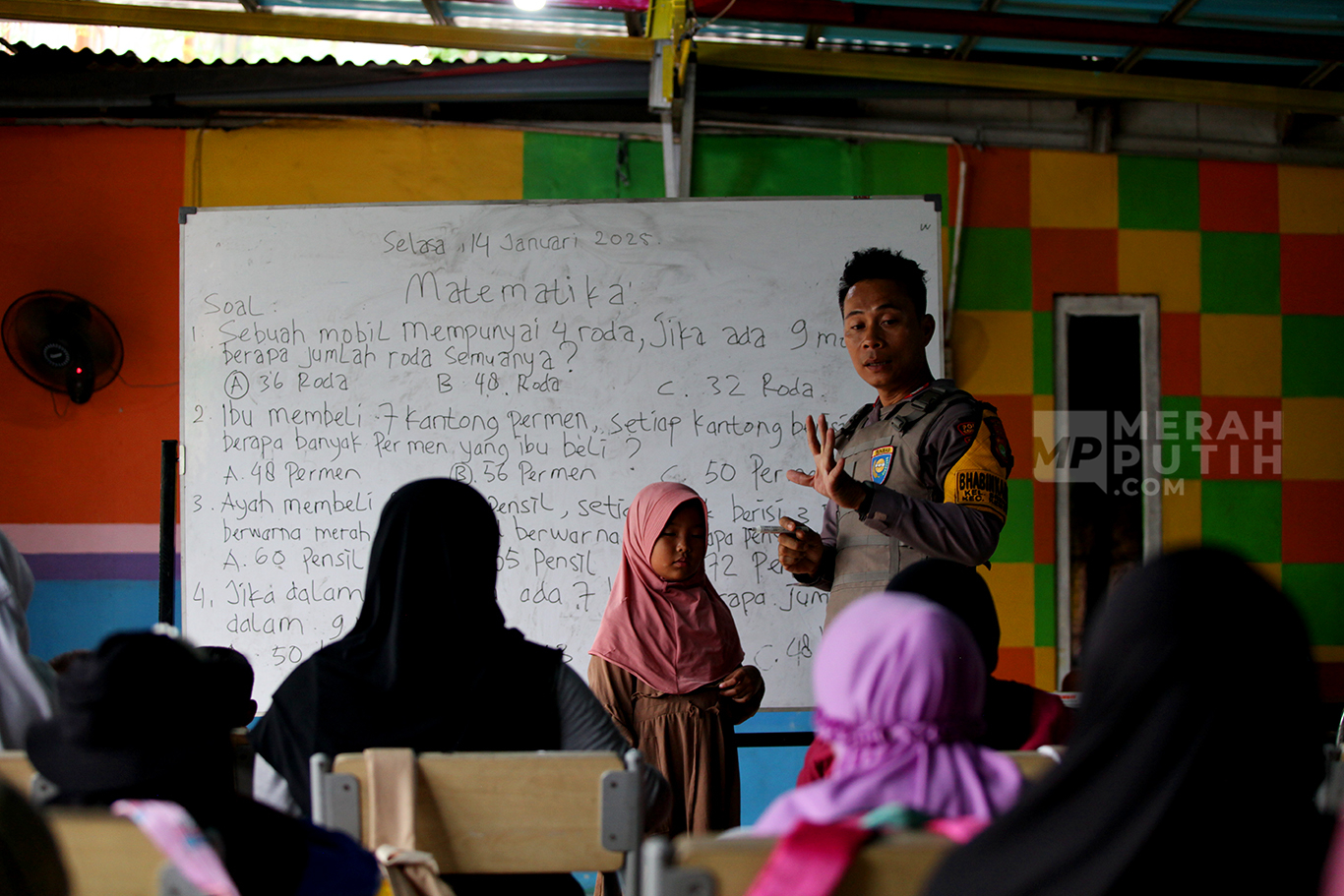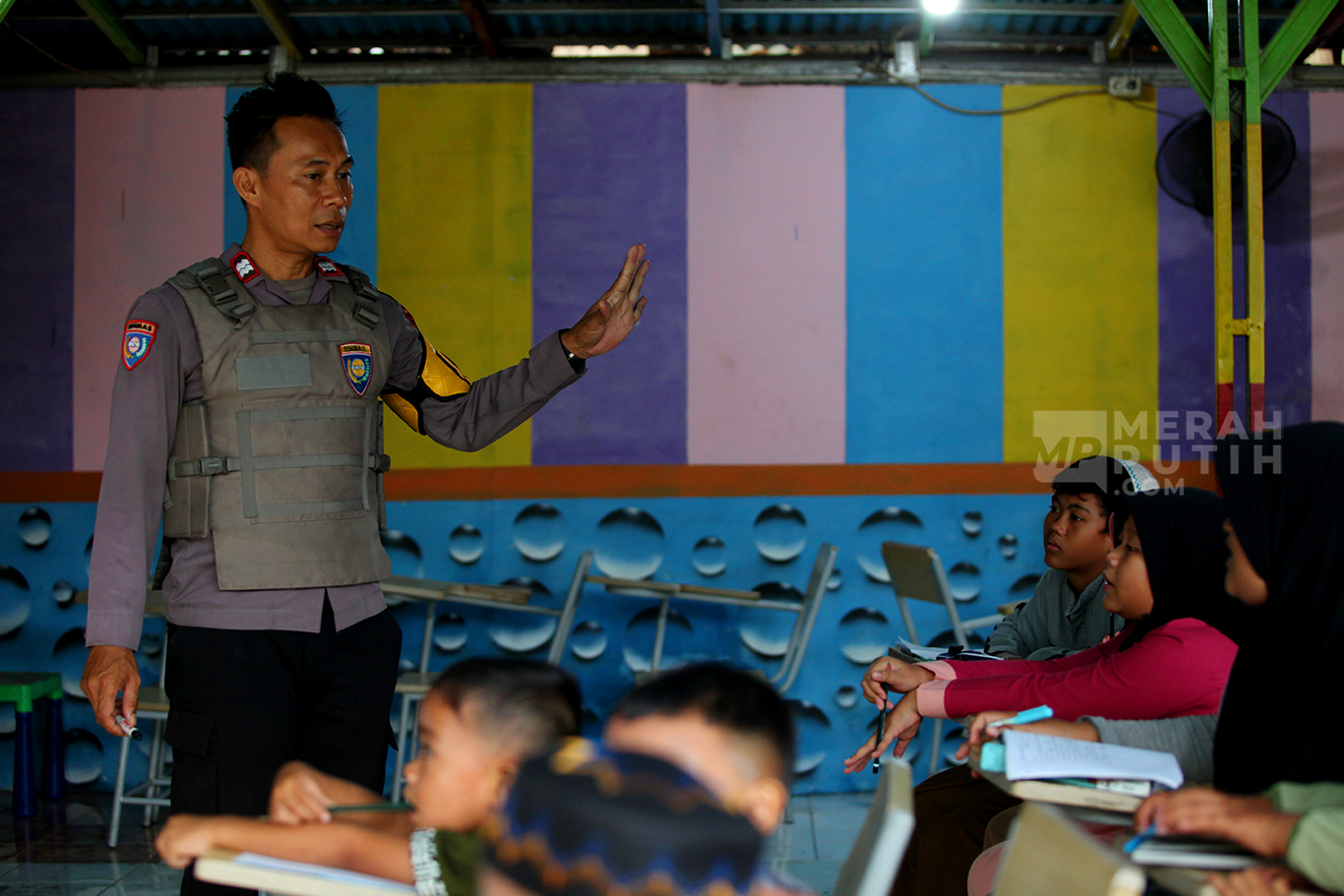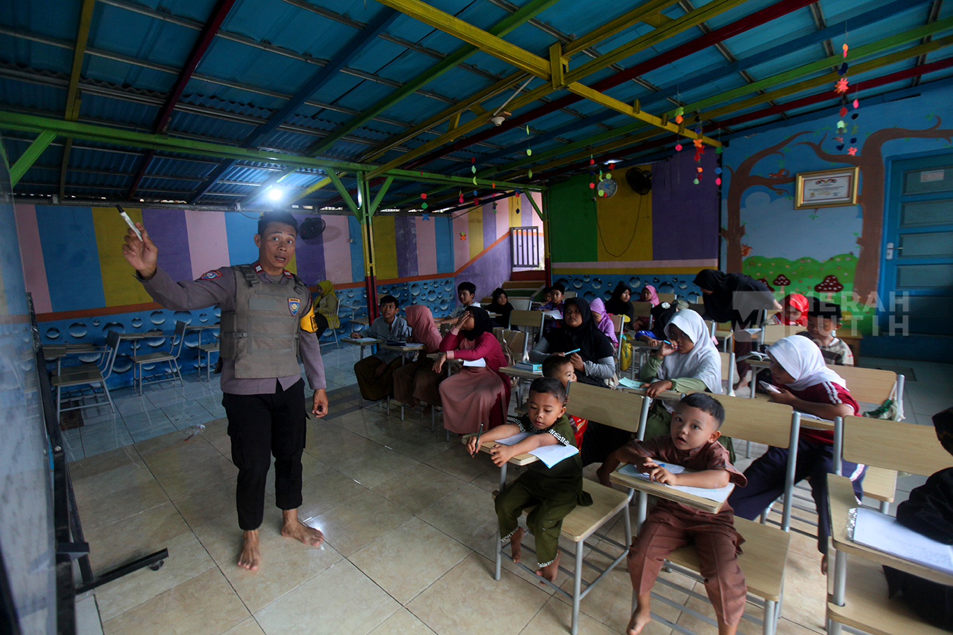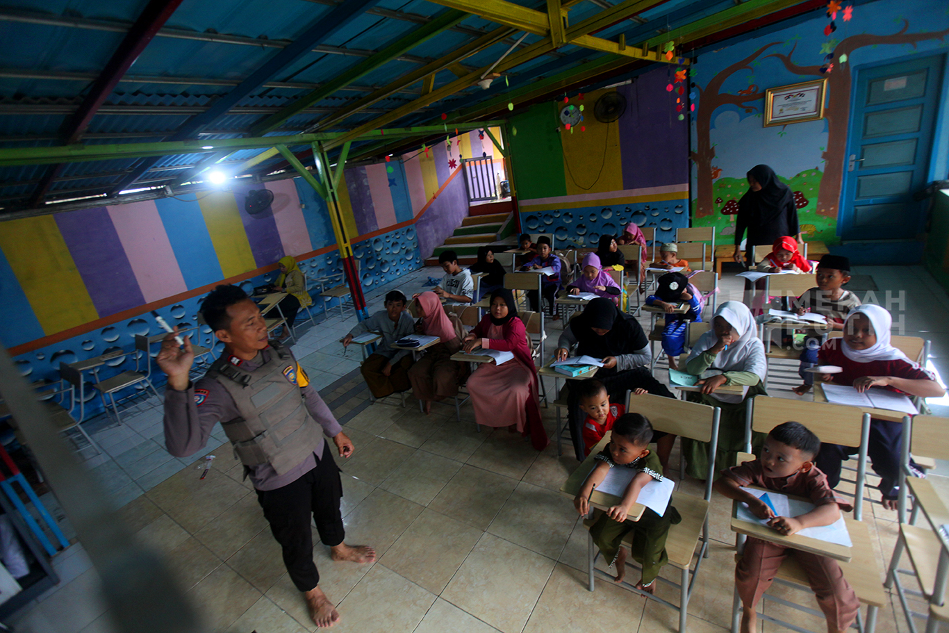 Merahputih.com - Aiptu Agus Riyanto mengajar anak-anak sekolah dasar di Sekolah Anak Percaya di Jalan Sawah Balong, Kawasan Srengseng, Kembangan, Jakarta Barat, Selasa (14/1/2025).