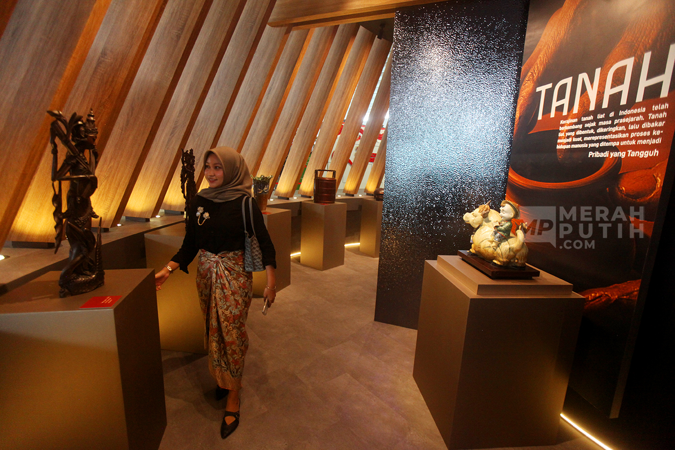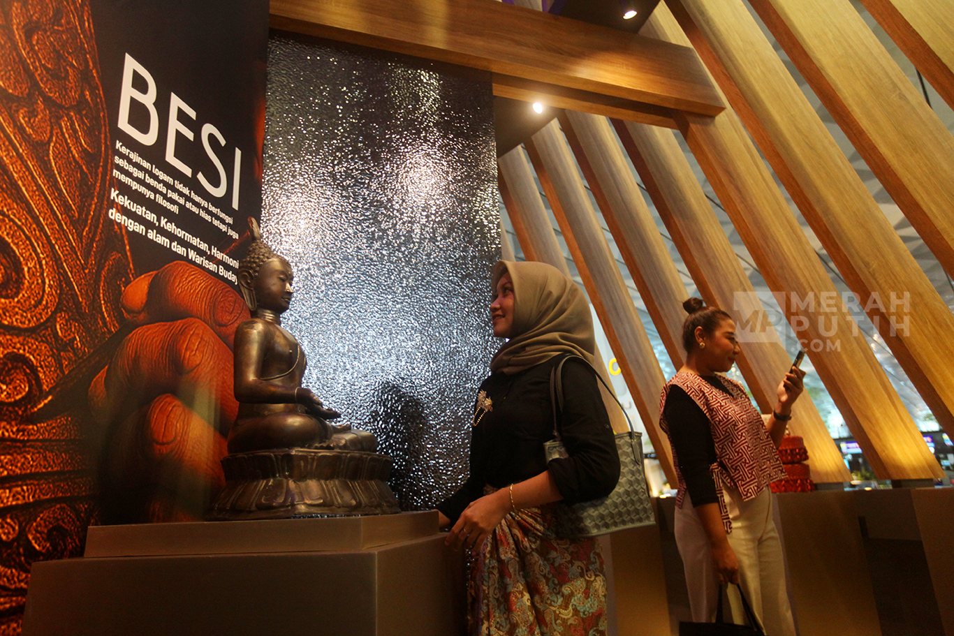 Merahputih.com - Calon penumpang mengamati karya seni produk nusantara dalam ruang instalasi arsitektural Nusantara Heritage bertajuk Tanah Api, Jejak Jiwa di Terminal 3 Bandara Soekarno-Hatta, Tangerang, Banten, Kamis (14/8/2025).