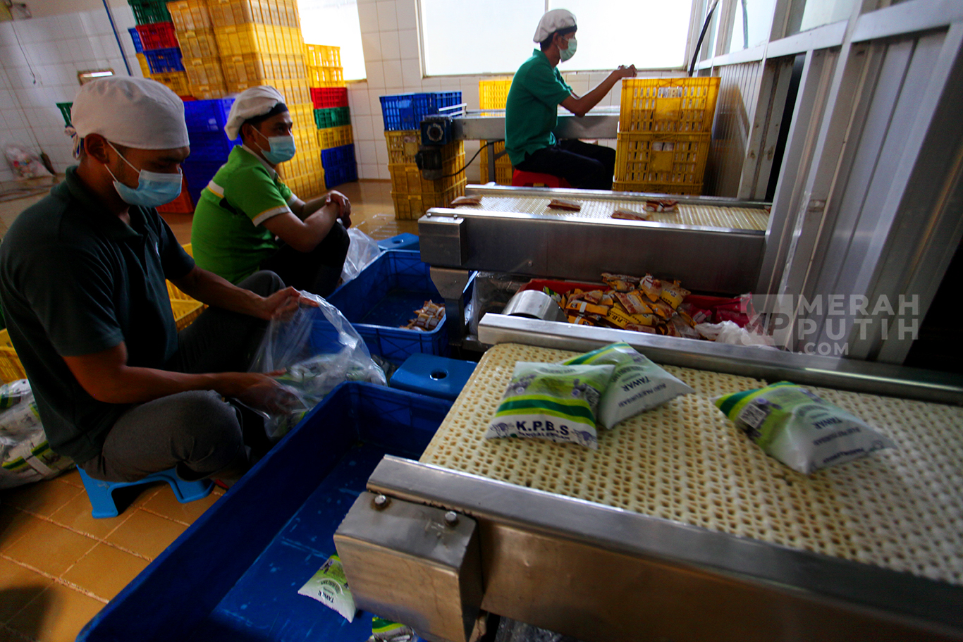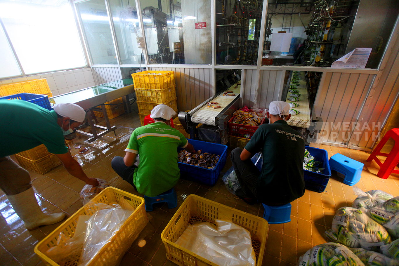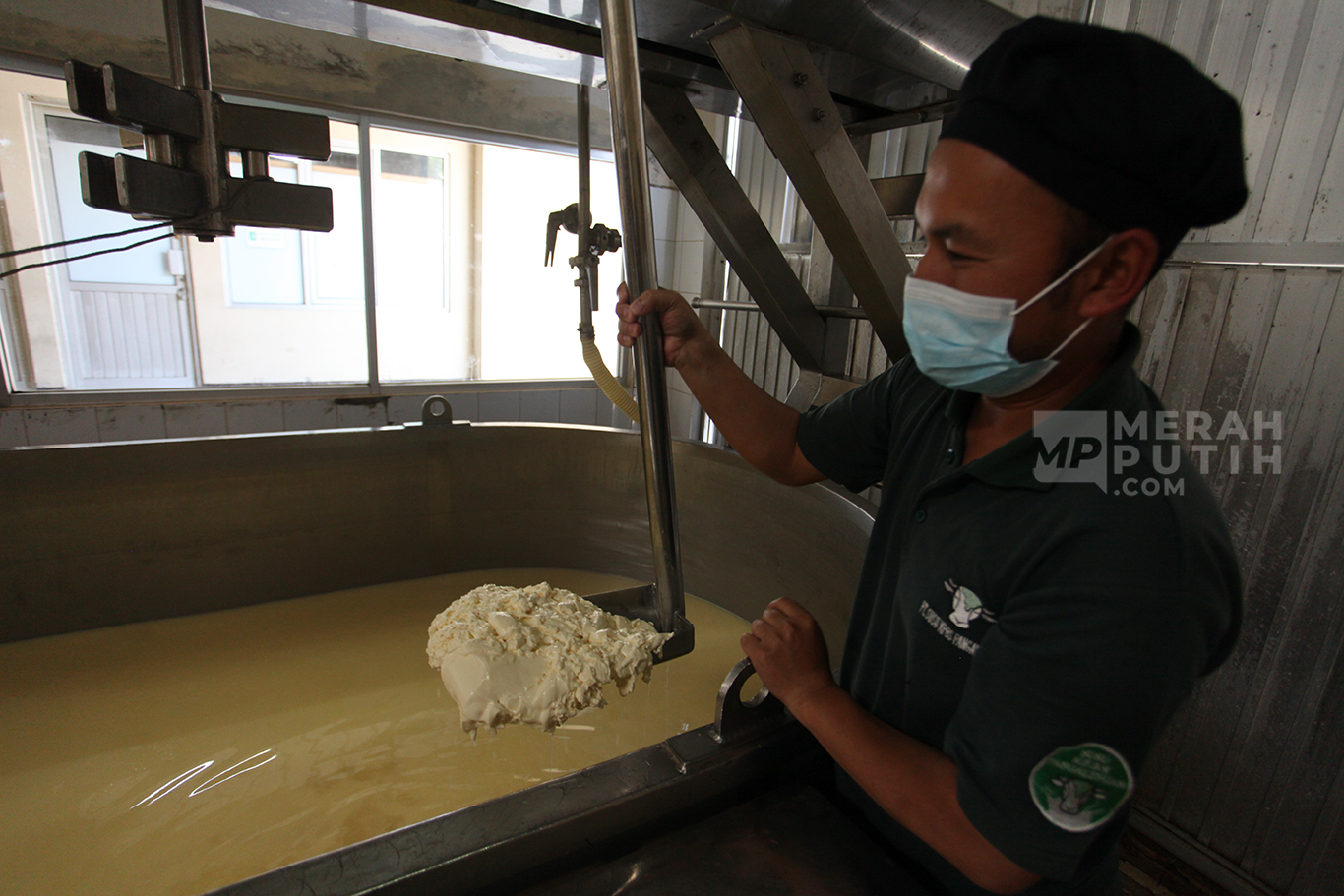 Merahputih.com - Pekerja menunjukkan produk susu kemasan di KPBS Pengalengan, Sabtu (18/2/2025).