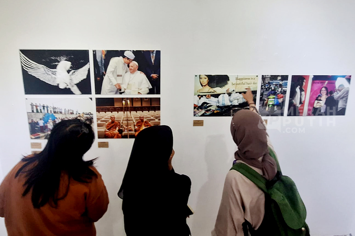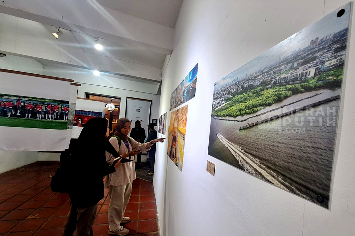 Merahputih.com - Pengunjung melihat foto yang dipamerkan pada pameran foto Rekam Jakarta bertajuk Metamorph di Cemara 6 Galeri, Jakarta Pusat, Jumat (22/8/2025).