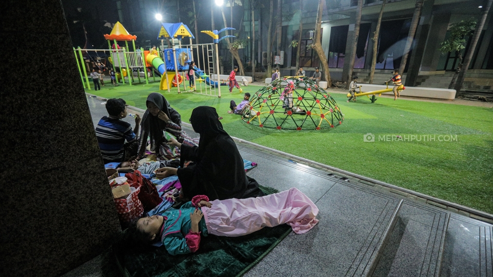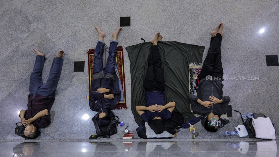 Sejumlah umat muslim tengah tertidur sebelum melaksanakan salat Tahajud berjamaah saat mengikuti kegiatan I'tikaf pada malam ke-29 bulan Ramadan 1440 H di Masjid Raya Al-Azhom, Kota Tangerang, Senin, (3/6/2019). Pada 10 malam terakhir Ramadan khususnya pada malam ganjil atau malam Lailatul Qodar, Masjid Raya Al-Azhom dihadiri ribuan umat muslim yang ingin melaksanakan I'tikaf. Merahputih.com / Rizki Fitrianto