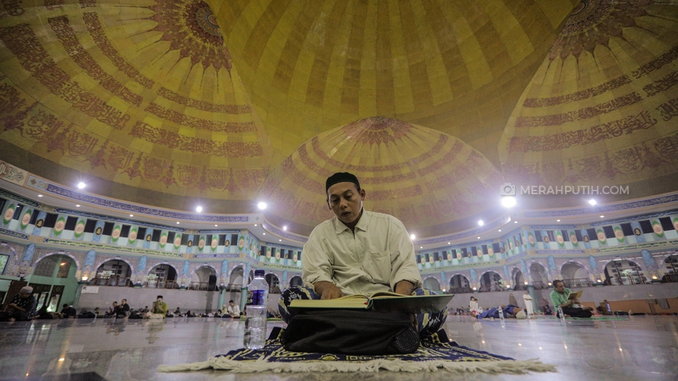 Seorang umat muslim tengah membaca kitab suci Al-Qur'an saat melaksanakan I'tikaf pada malam ke-29 bulan Ramadan 1440 H di Masjid Raya Al-Azhom, Kota Tangerang, Senin, (3/6/2019). Pada 10 malam terakhir Ramadan khususnya pada malam ganjil atau malam Lailatul Qodar, Masjid Raya Al-Azhom dihadiri ribuan umat muslim yang ingin melaksanakan I'tikaf. Merahputih.com / Rizki Fitrianto