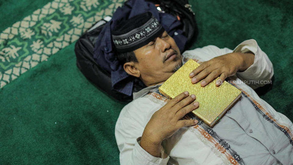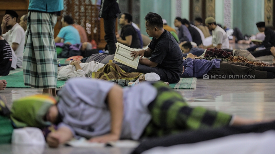 Seorang umat muslim tengah tertidur sebelum melaksanakan salat Tahajud berjamaah saat mengikuti kegiatan I'tikaf pada malam ke-29 bulan Ramadan 1440 H di Masjid Raya Al-Azhom, Kota Tangerang, Senin, (3/6/2019). Pada 10 malam terakhir Ramadan khususnya pada malam ganjil atau malam Lailatul Qodar, Masjid Raya Al-Azhom dihadiri ribuan umat muslim yang ingin melaksanakan I'tikaf. Merahputih.com / Rizki Fitrianto