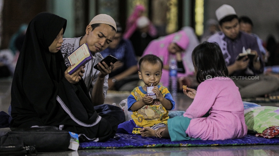 Sepasang suami istri membawa anak-anak mereka saat melaksanakan I'tikaf pada malam ke-29 bulan Ramadan 1440 H di Masjid Raya Al-Azhom, Kota Tangerang, Senin, (3/6/2019). Pada 10 malam terakhir Ramadan khususnya pada malam ganjil atau malam Lailatul Qodar, Masjid Raya Al-Azhom dihadiri ribuan umat muslim yang ingin melaksanakan I'tikaf. Merahputih.com / Rizki Fitrianto