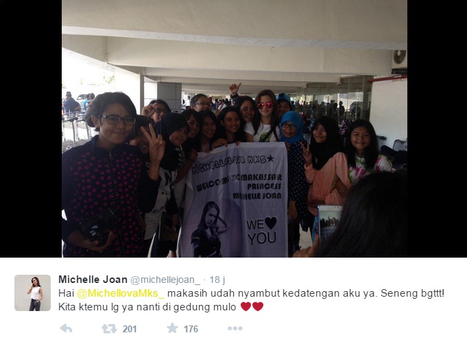 “Hai @MichellovaMks_ makasih udah nyambut kedatengan aku ya. Seneng bgttt!”, tulis Michelle Joan di twitternya.