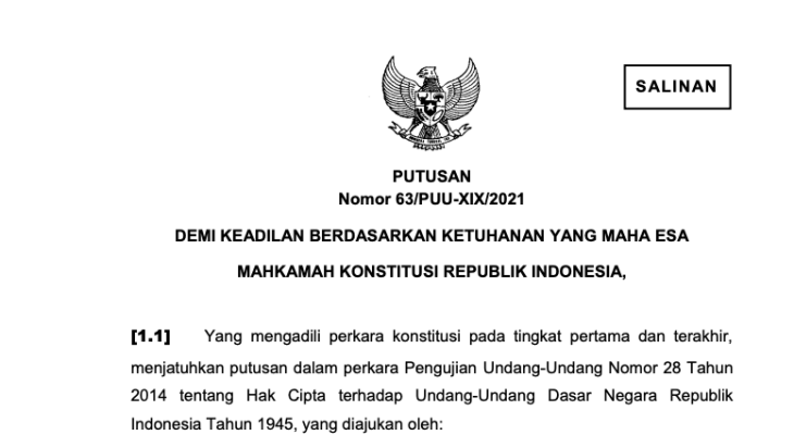 “Norma pasal 63 ayat (1) huruf b UU 28/2014 lebih berkaitan dengan substansi Pasal 58 ayat (1), di mana Pasal 63 ayat (1) huruf b memberikan perlindungan hak ekonomi, sedangkan pasal 58 ayat (1) memberikan Perlindungan Hak Cipta atas Ciptaan, perlindungan hak ekonomi atas Pertunjukan dan Produser Fonogram selama 50 (lima puluh) tahun,” tulis MK. (far)
