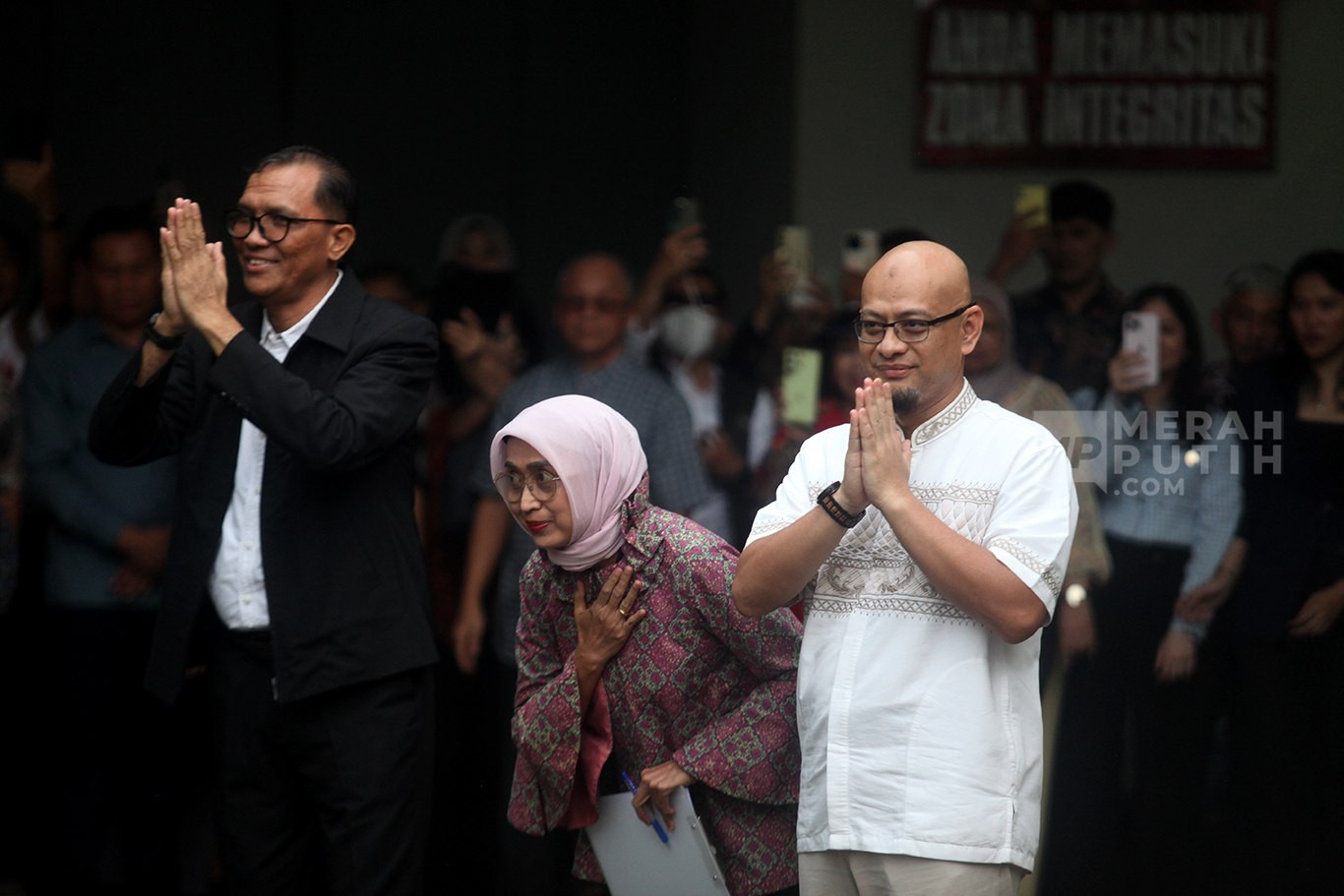 Merahputih.com - Mantan terpidana kasus korupsi proses Kerja Sama Usaha (KSU) dan akuisisi PT Jembatan Nusantara oleh PT Angkutan Sungai, Danau, dan Penyeberangan (ASDP) Indonesia Ferry (Persero) tahun 2019–2022, yakni Ira Puspadewi (tengah), Muhammad Yusuf Hadi (kiri), dan Harry Muhammad Adhi Caksono (kanan), menyapa wartawan usai dibebaskan dari Rumah Tahanan (Rutan) KPK Cabang Gedung Merah Putih, Jakarta, Jumat (28/11/2025).