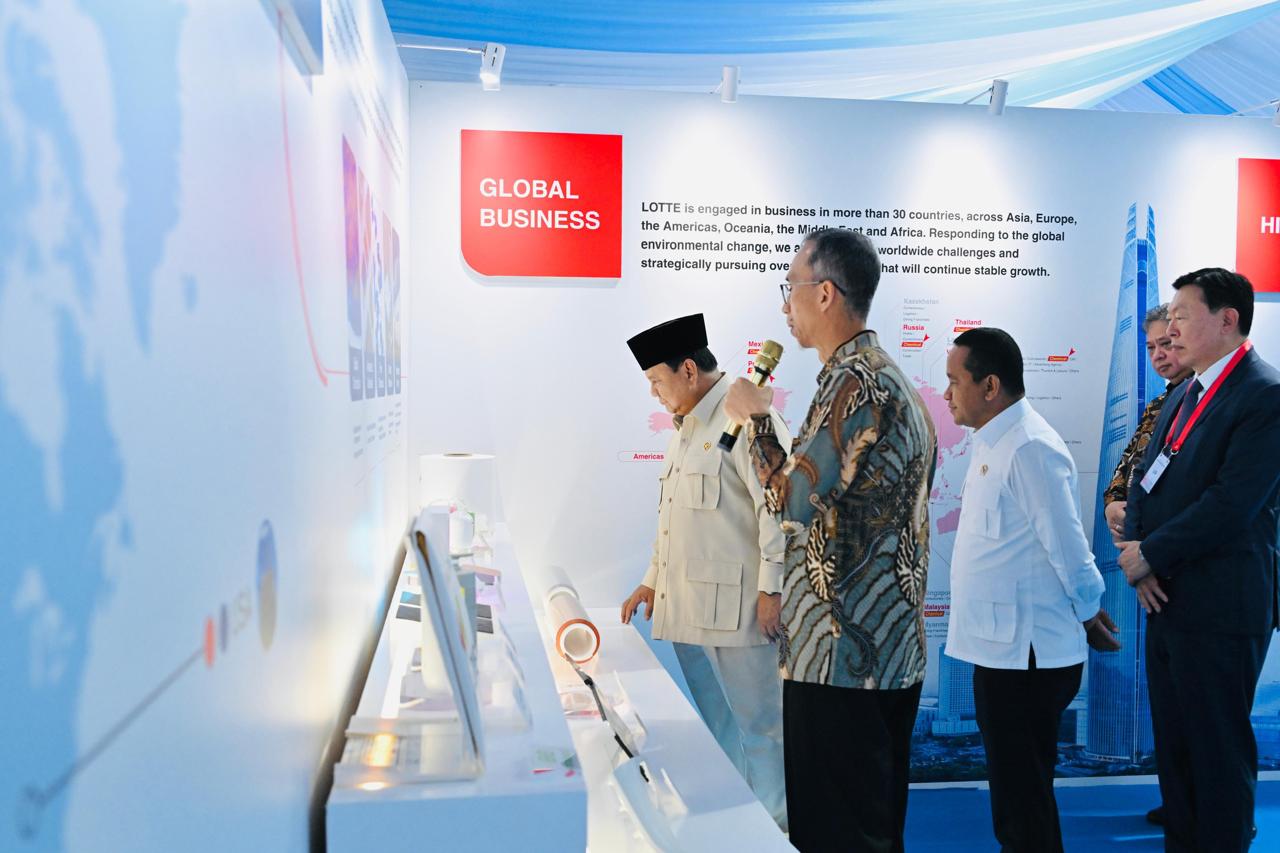 Presiden Prabowo Subianto meresmikan operasional PT Lotte Chemical Indonesia sebagai pabrik petrokimia terbesar se-Asia Tenggara yang dapat memproduksi 1.000 kiloton per tahun (kTA) ethylene, 520 kTA propylene, 350 kTA polypropylene, serta 140 kTA butadiene dengan pembangunan pabrik menelan investasi sekitar 4 miliar dolar AS. (Foto: Laily Rachev - Biro Pers Sekretariat Presiden).