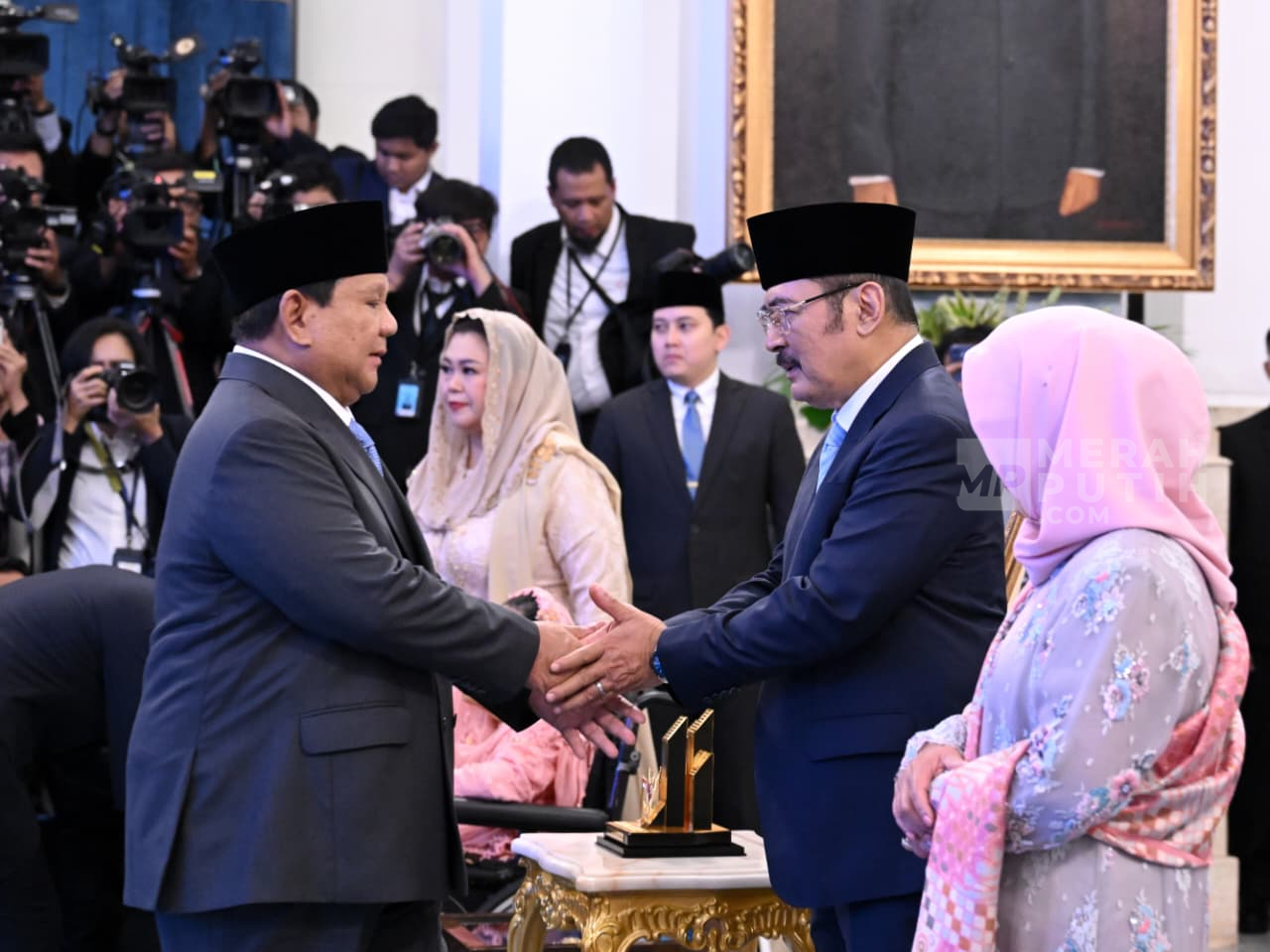 Merahputih.com - Presiden Prabowo Subianto (kiri) memberikan selamat kepada putra presiden kedua RI Jenderal Besar TNI H.M. Soeharto (kanan) Bambang Trihatmodjo (kiri) dan Siti Hardijanti Hastuti Rukmana usai upacara pemberian gelar pahlawan kepada Soeharto dan sembilan tokoh lainnya di Istana Negara, Jakarta, Senin (10/11/2025).