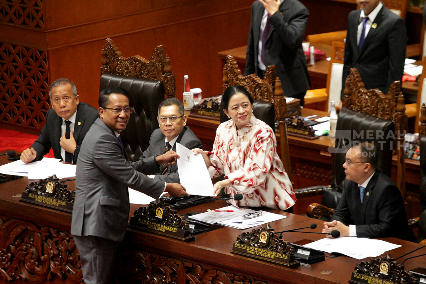 Merahputih.com - Menteri Hukum Supratman Andi Agtas (kedua kiri) menyerahkan berkas pendapat akhir kepada Ketua DPR Puan Maharani (kanan) yang disaksikan oleh Wakil Ketua DPR Adies Kadir (kedua kanan) dan Saan Mustopa (kiri) pada Rapat Paripurna ke-8 DPR RI Masa Persidangan II Tahun Sidang 205-2026 di Kompleks Parlemen, Senayan, Jakarta, Selasa (18/11/2025).