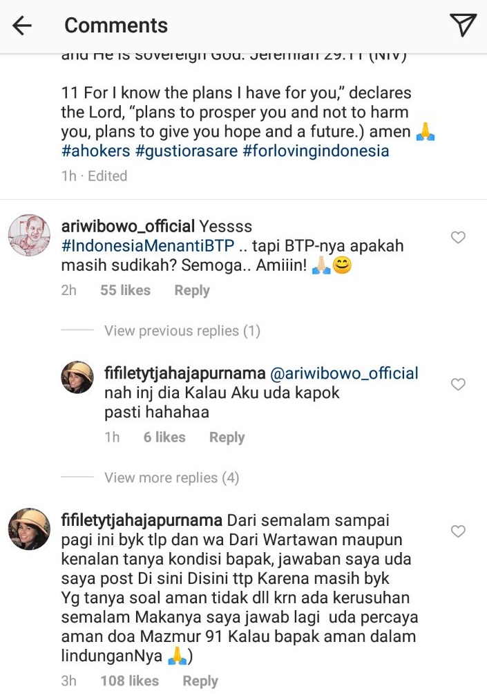 "Dari semalam sampai pagi ini banyak telpon dan WA dari wartawan maupun kenalan tanya kondisi Bapak. Jawaban saya udah saya post di sini. Karena masih banyak yang tanya soal aman tidak dll karena ada kerusuhan semalam. Makanya saya jawab lagi udah percaya aman doa Mazmur 91 kalau bapak aman dalam lindungan-Nya," jawab Fifi di kolom komentar di salah satu postingannya, Rabu (9/5).