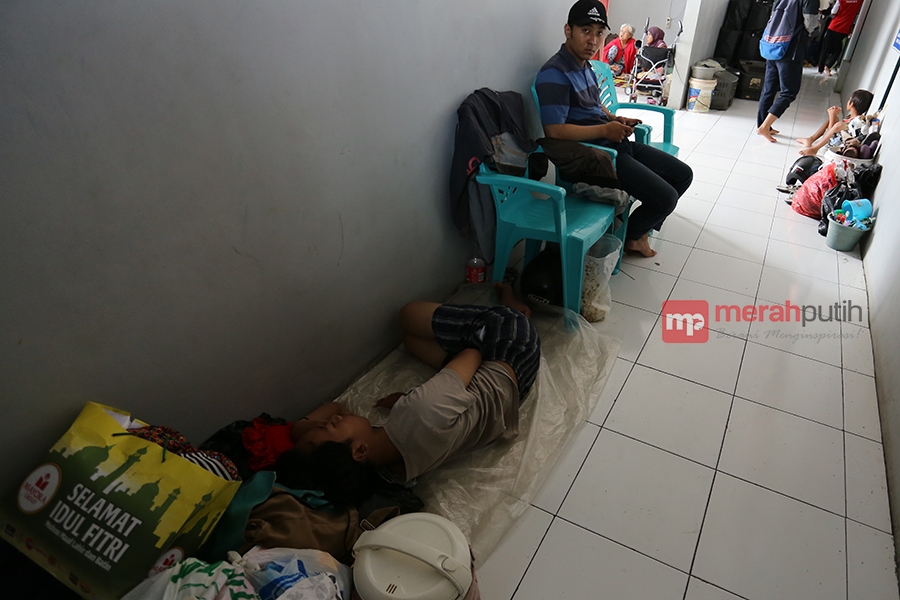 Terbatasnya tempat pengungsian di Gelanggang Olah Raga (GOR) Kelurahan Gembor membuat beberapa pengungsi harus rela beristirahat di lorong GOR dengan sejumlah harta bendanya. (Fyn)