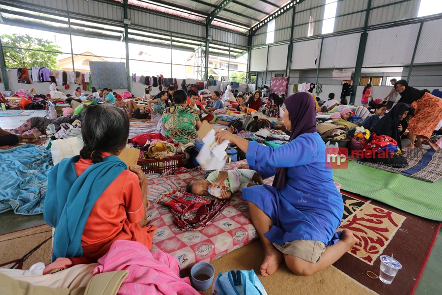 Para pengungsi banjir warga perumahan Total Persada Kota Tangerang telah mengungsi di Gelanggang Olah Raga (GOR) Kelurahan Gembor sejak dini hari tadi pukul 3.00 pagi setelah air sungai melewati tanggul perumahan Total Persada.