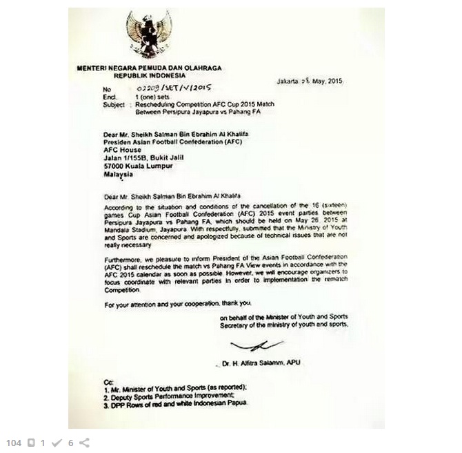 Surat dari sekertaris Menpora tersebut secara garis besar yaitu berisi tentang permintaan Menpora untuk penundaan jadwal penundaan pertandingan antara Persipura Jayapura Vs Pahang FC.