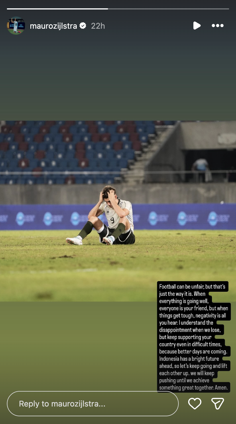 MerahPutih.com - Penyerang Timnas Indonesia U-23, Mauro Zijlstra memahami kekecewaan suporter menyusul kekalahan 0-1 dari Filipina di Grup C sepak bola putra SEA Games 2025. Kekalahan itu membuat peluang Indonesia untuk lolos kecil.