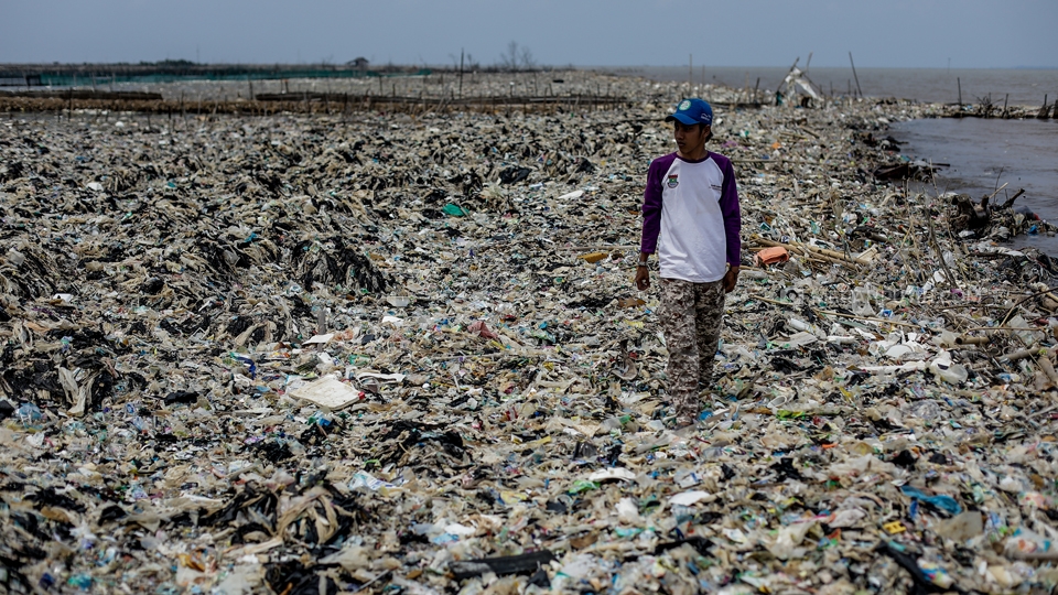 Warga melintasi tumpukan sampah plastik membentang sepanjang pantai sekitar muara sungai Cisadane di Tanjung Burung, Teluk Naga, Kabupaten Tangerang, Banten, Senin, (16/12/2019). Tumpukan sampah yang berasal dari limbah rumah tangga maupun pabrik tersebut didominasi sampah plastik yang terbawa arus sungai Cisadane hingga di muara. Sampah tersebut mengendap bertahun-tahun hingga melapisi daratan di sekitar muara sungai Cisadane. Diperkirakan luas pantai sampah tersebut 2,5 Kilometer dengan ketebalan 3 meter dari permukaan laut. Merahputih.com / Rizki Fitrianto