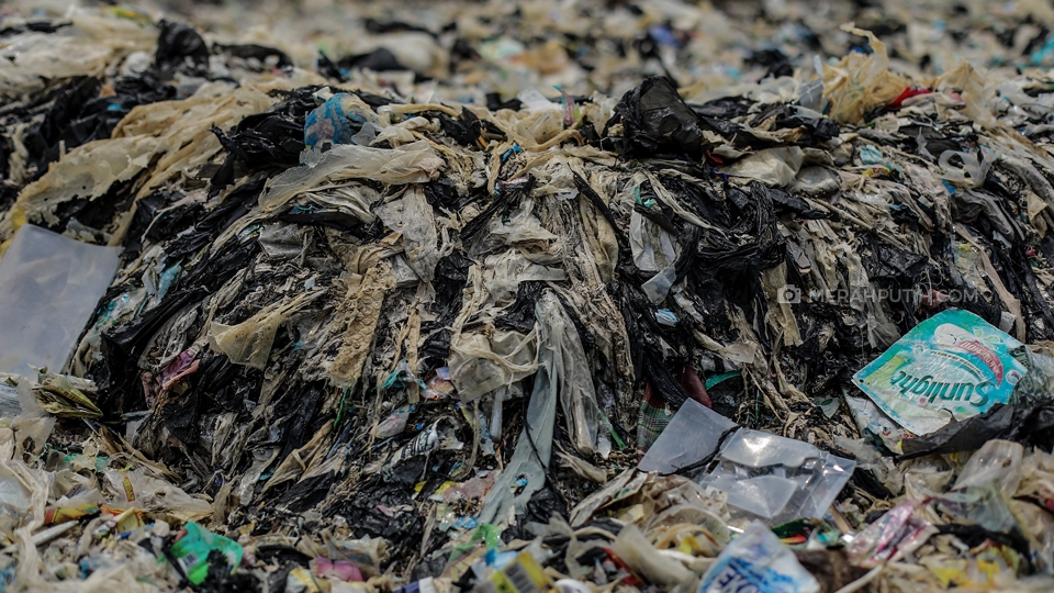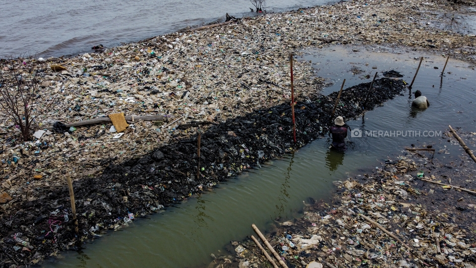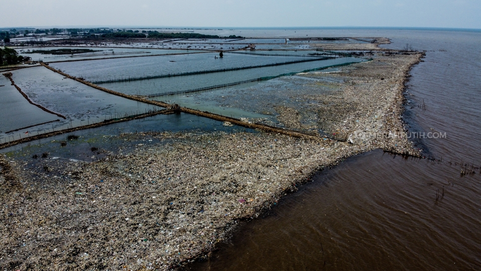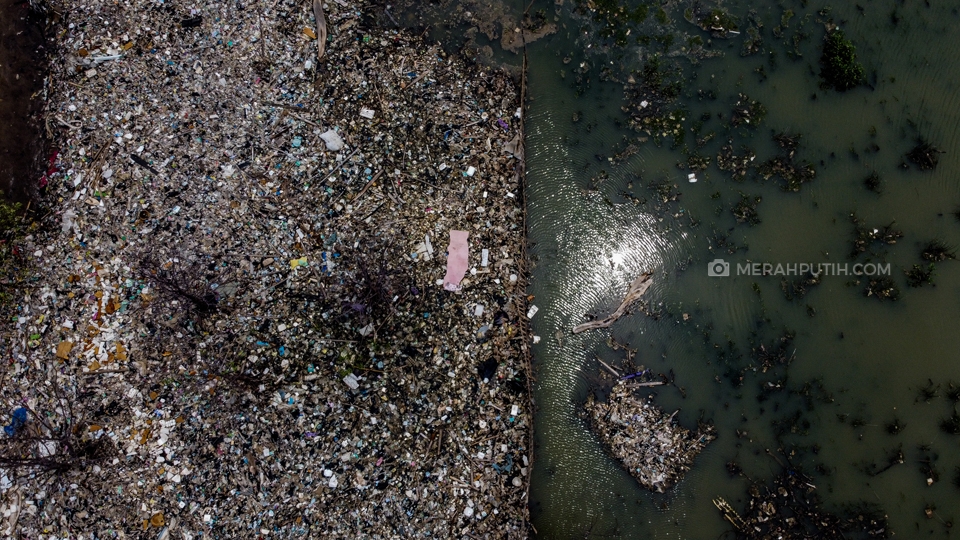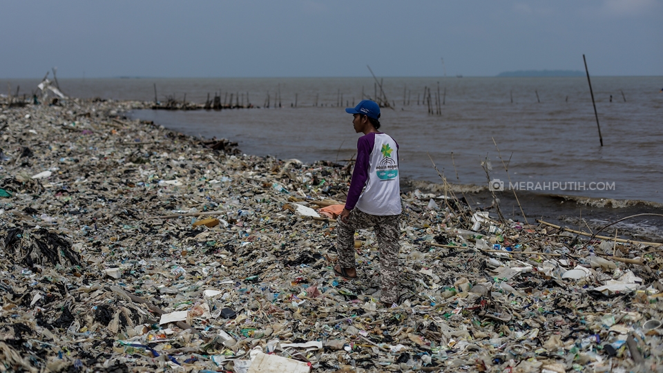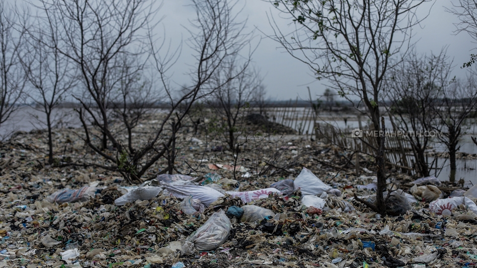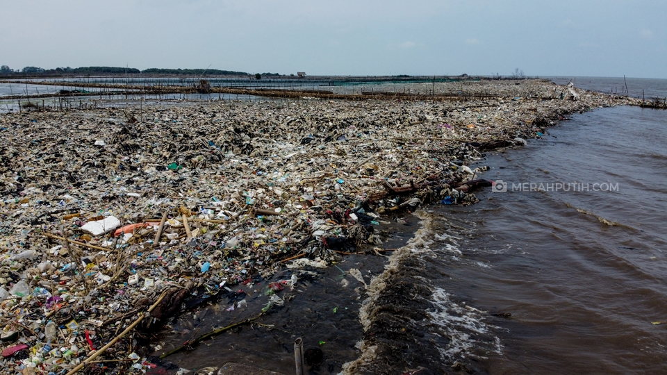 Tumpukan sampah plastik membentang sepanjang pantai sekitar muara sungai Cisadane di Tanjung Burung, Teluk Naga, Kabupaten Tangerang, Banten, Senin, (16/12/2019). Tumpukan sampah yang berasal dari limbah rumah tangga maupun pabrik tersebut didominasi sampah plastik yang terbawa arus sungai Cisadane hingga di muara. Sampah tersebut mengendap bertahun-tahun hingga melapisi daratan di sekitar muara sungai Cisadane. Diperkirakan luas pantai sampah tersebut 2,5 Kilometer dengan ketebalan 3 meter dari permukaan laut. Merahputih.com / Rizki Fitrianto