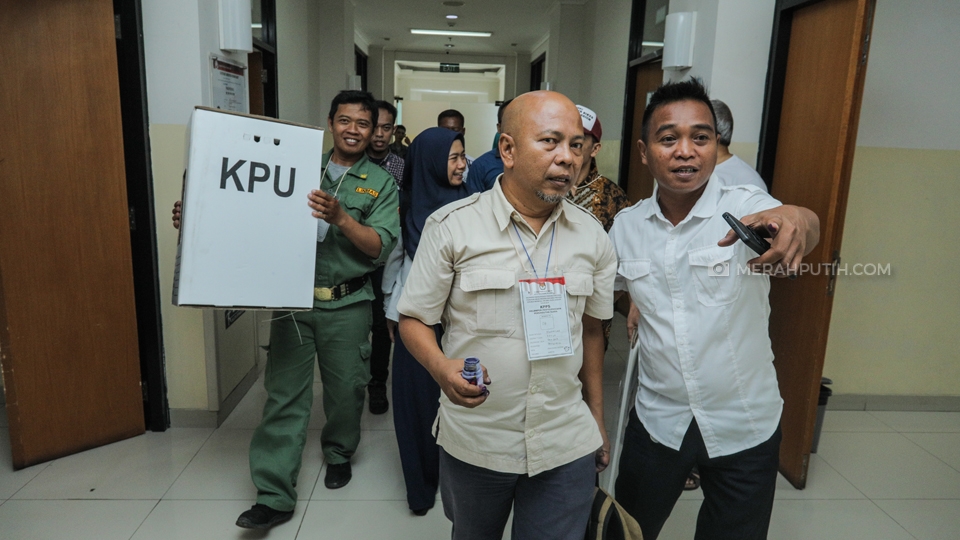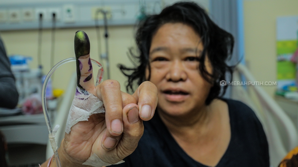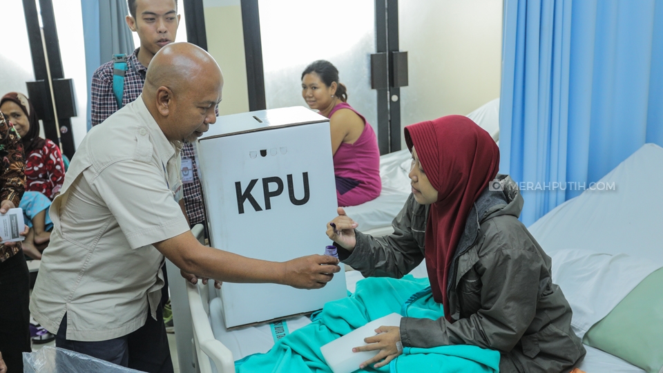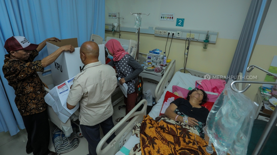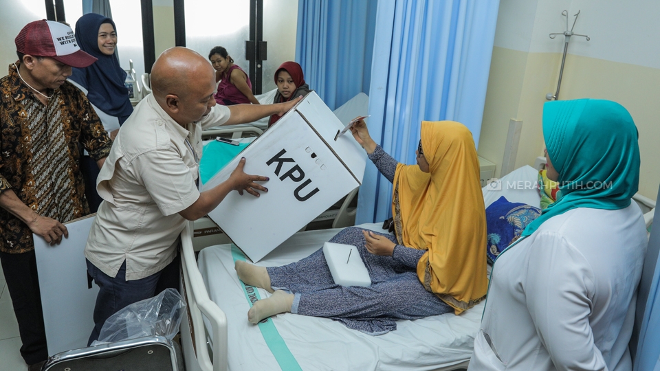 Pasien menggunakan hak pilih pada Pemilihan Umum (Pemilu) 2019 di Rumah Sakit Umum Tangerang Selatan, Tangerang Selatan, Banten, Rabu, (17/4/2019). Sebanyak 18 pasien RSU Tangerang Selatan yang mendapat kesempatan untuk menggunakan hak pilih di TPS 008 Kelurahan Pamulang Barat, Tangerang Selatan, Banten . Merahputih.com/Rizki Fitrianto