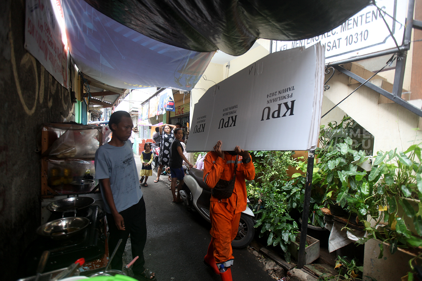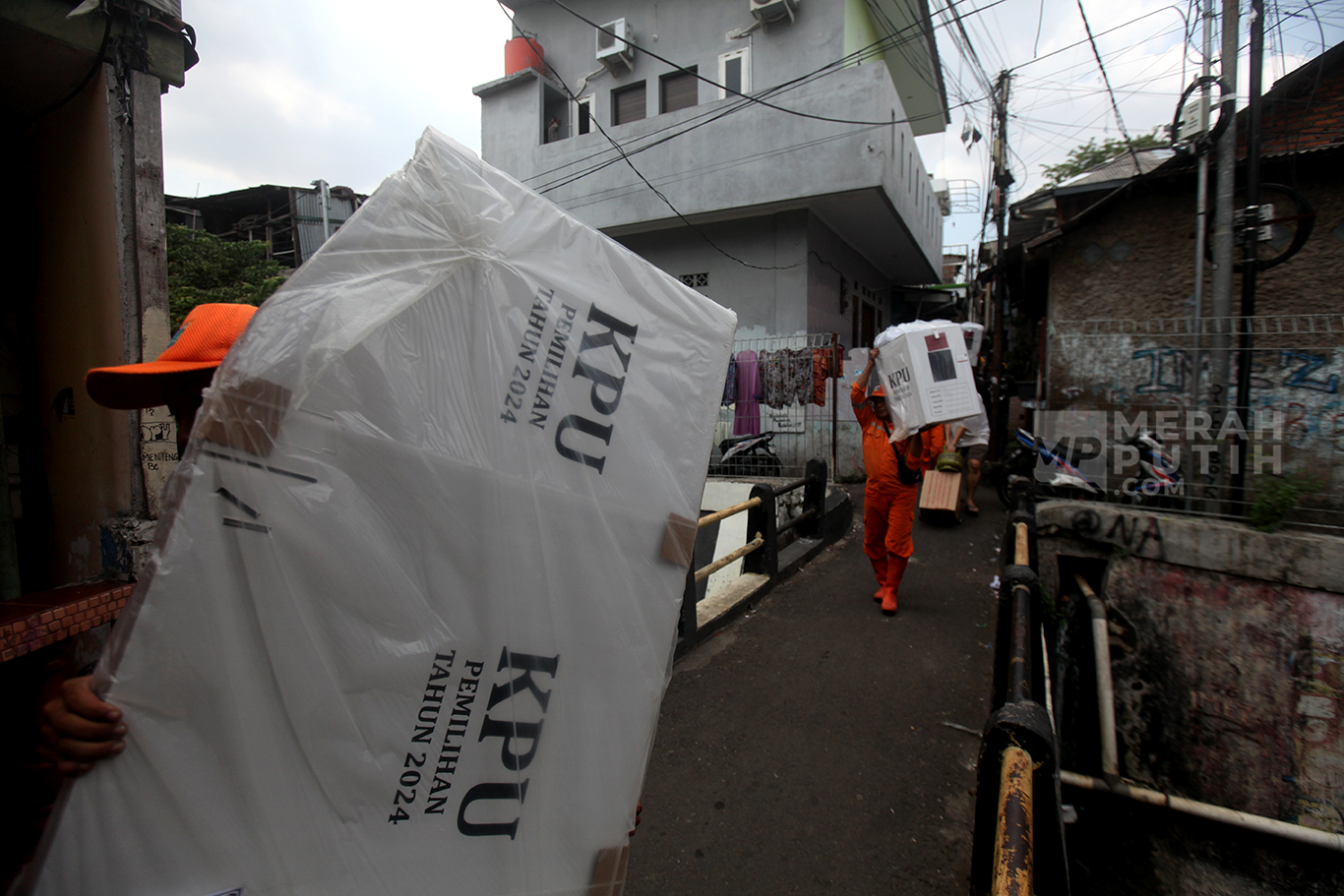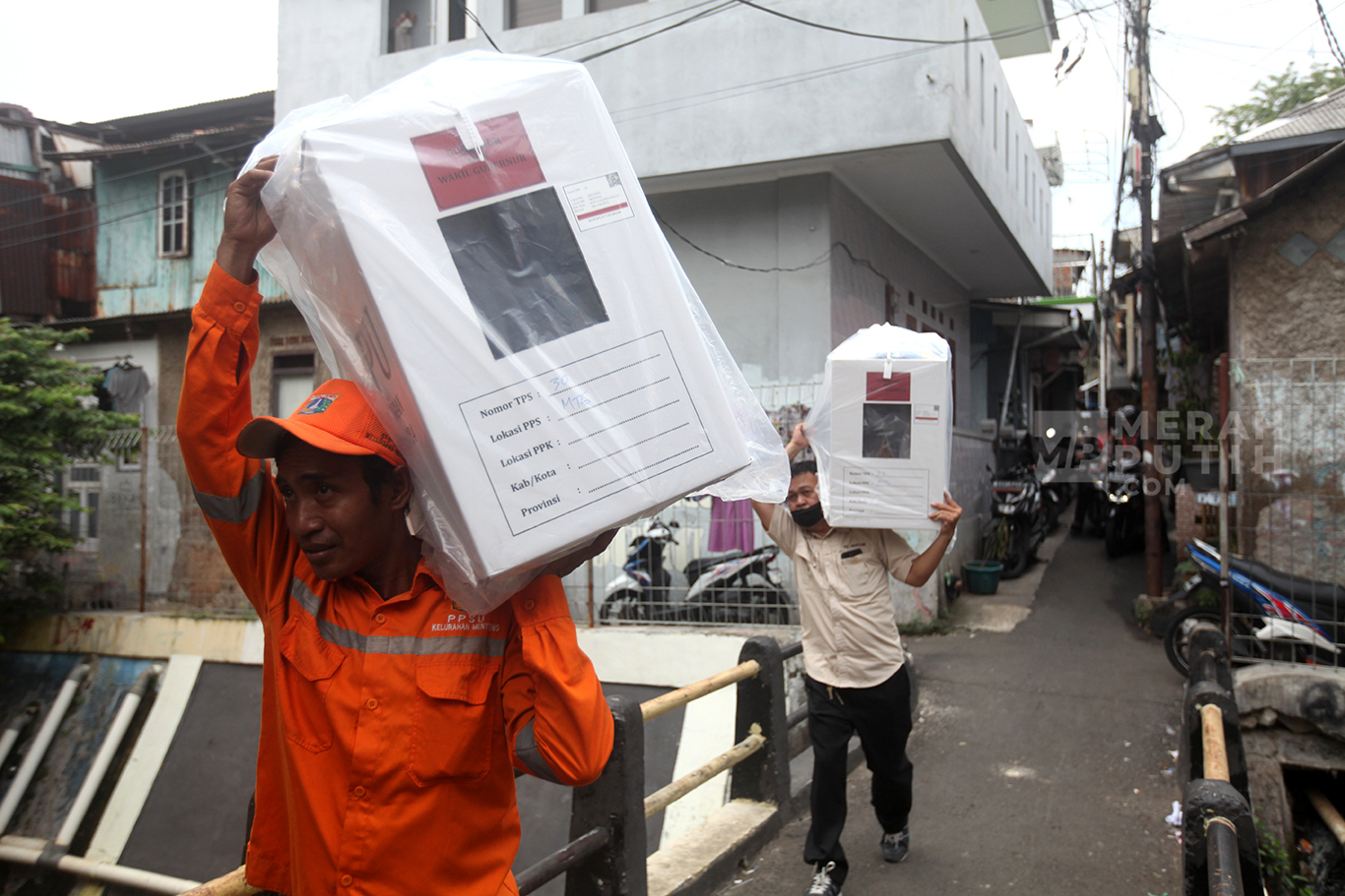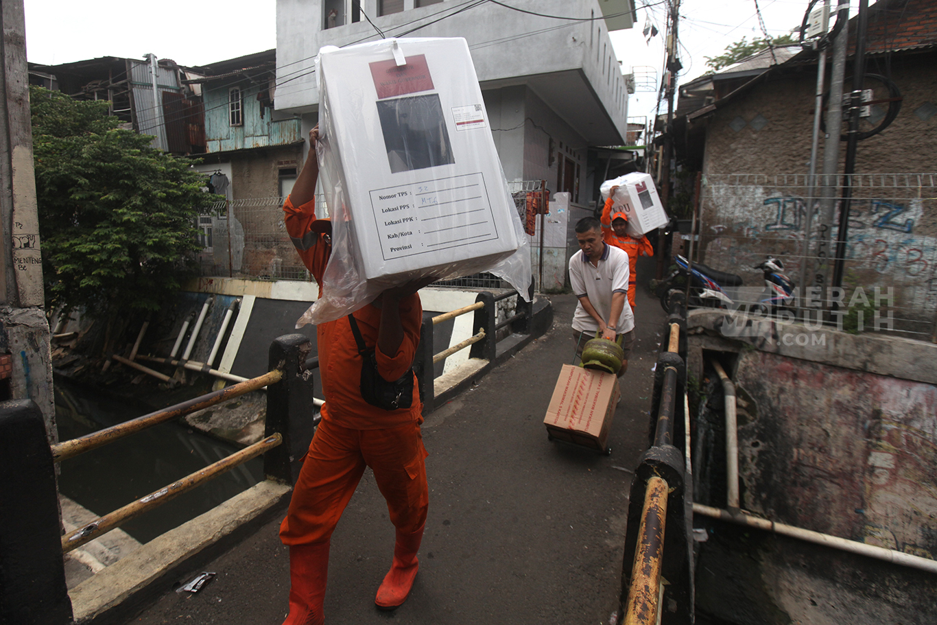 Merahputih.com - Petugas Pasukan Oren mebawa kotak suara berisi logistik Pilkada 2024 di Kawasan Menteng Jaya, Jakarta Pusat, Selasa (26/11/2024).