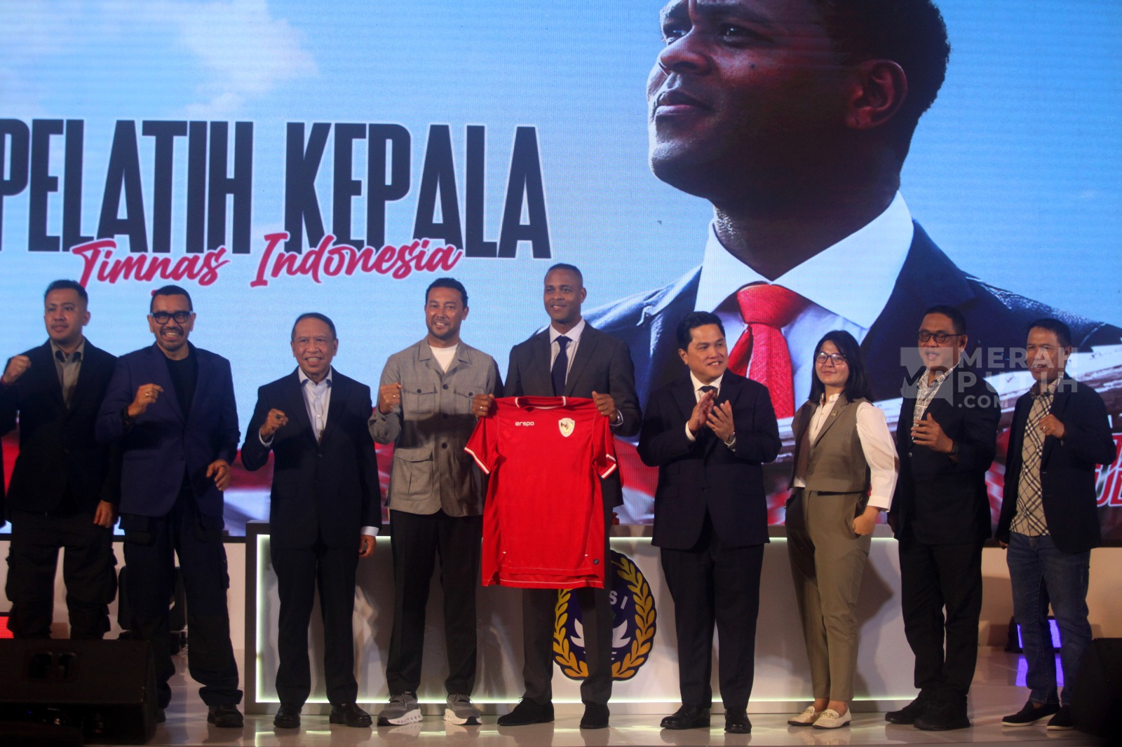Merahputih.com - Ketua PSSI, Erick Tohir (kanan) bersama Pelatih Kepala Timnas Indonesia, Patrick Kluivert (tengah) , dan Asisten Pelatih Timnas Denny Landzaat (kiri) menunjukkan jersey Timnas Indonesia saat konferensi pers pengenalan pelatih Timnas Indonesia di Hotel Mulia, Senayan, Jakarta, Minggu (12/1/2025).