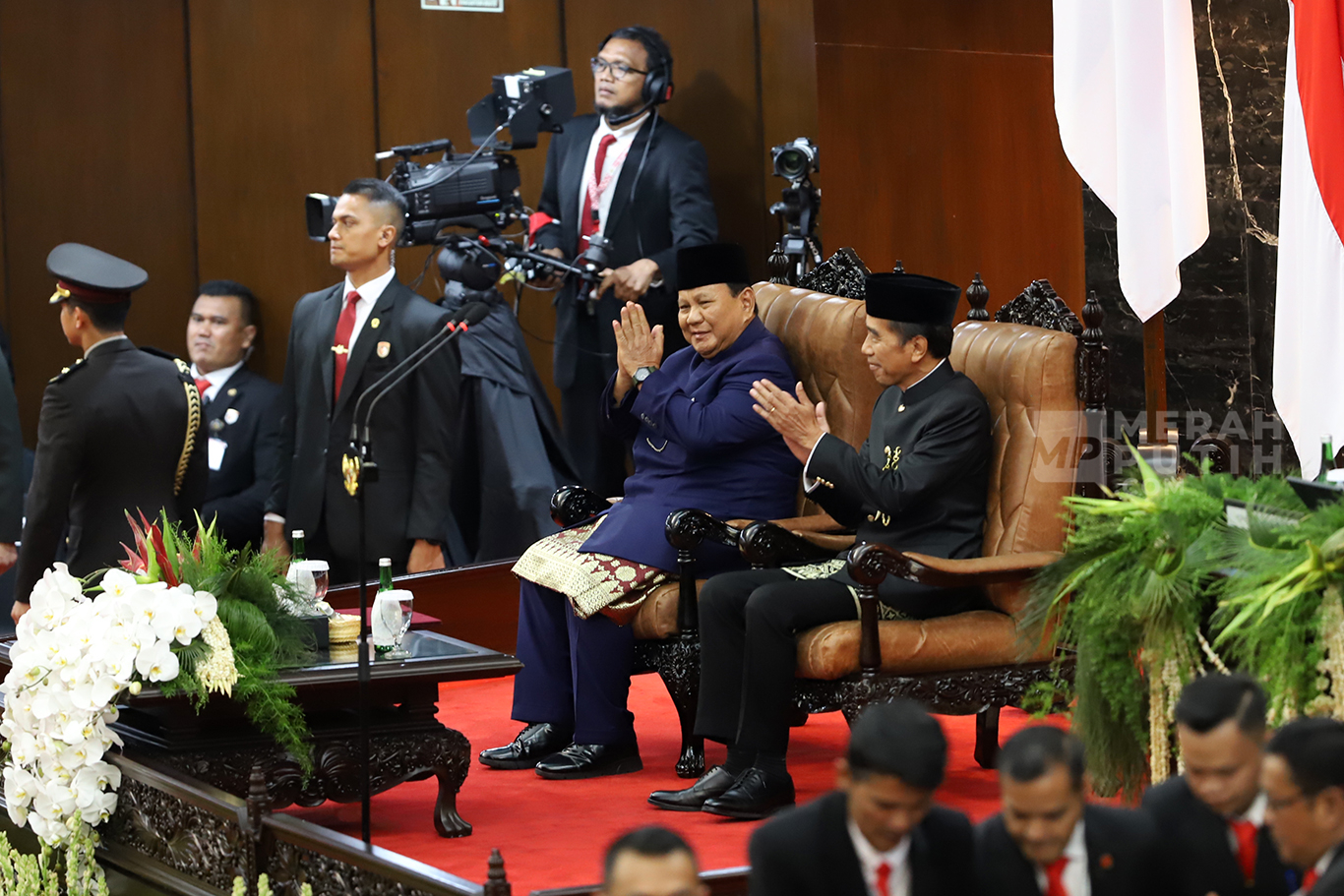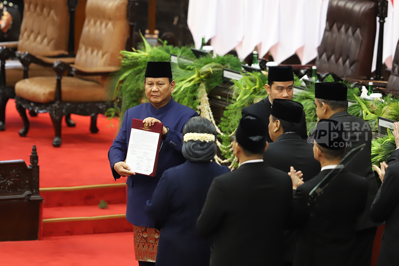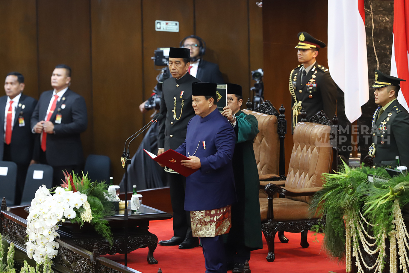 Presiden RI ke-8 Prabowo Subianto dan Wakil Presiden Gibran Rakabuming Raka resmi dilantik dan mengucap sumpah jabatanPresiden dan Wakil Presiden periode 2024-2029 dalam sidang paripurna MPR di Gedung Nusantara Kompleks Parlemen RI. Prabowo Subianto dan Gibran Rakabuming Raka mengucapkan sumpah jabatan yang dimulai sekitar pukul 10.30 WIB.(MP/Didik Setiawan).