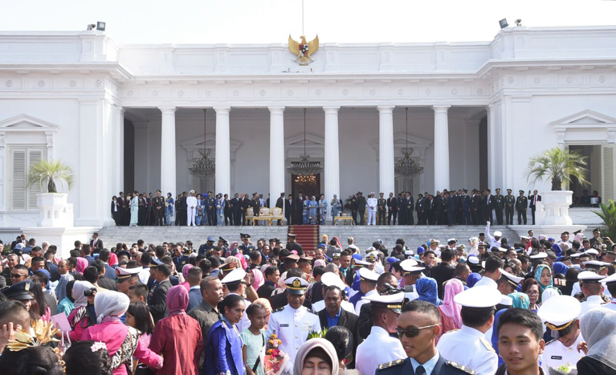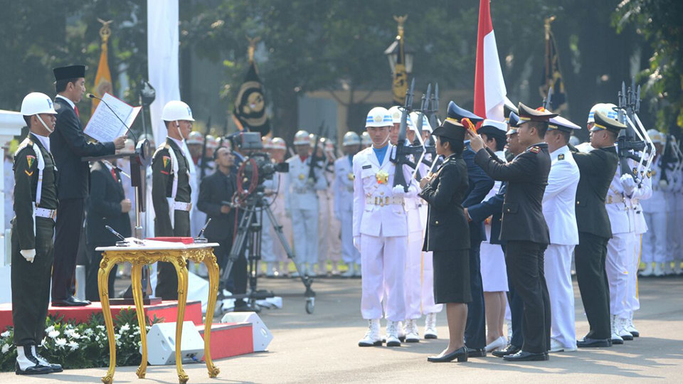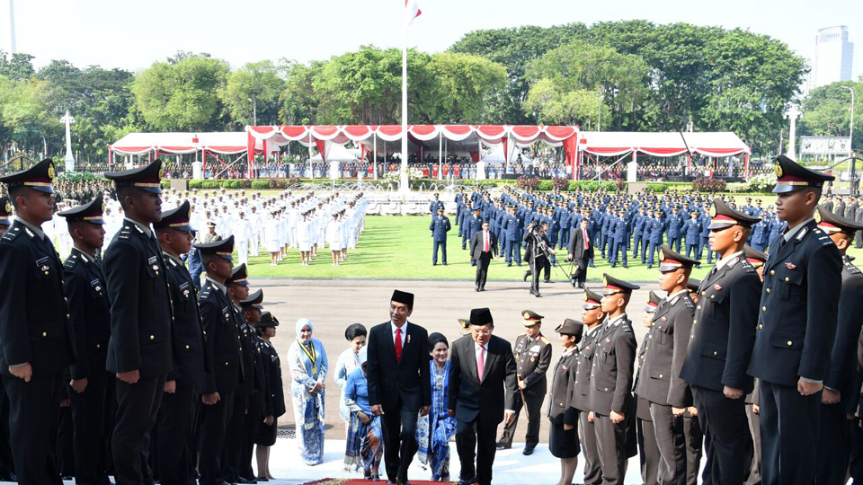 Presiden Joko Widodo memimpin secara langsung upacara Prasetya Perwira (Praspa) TNI-Polri tahun 2017 yang bertempat di halaman depan Istana Merdeka, Jakarta. Presiden yang bertindak selaku inspektur upacara pada kesempatan tersebut melantik dan mengambil sumpah para calon perwira remaja (capaja) yang berjumlah 728 orang. Selasa, (25/7). Foto: Biro Pers Setpres.
