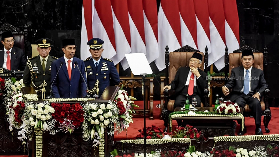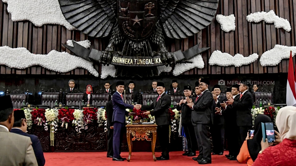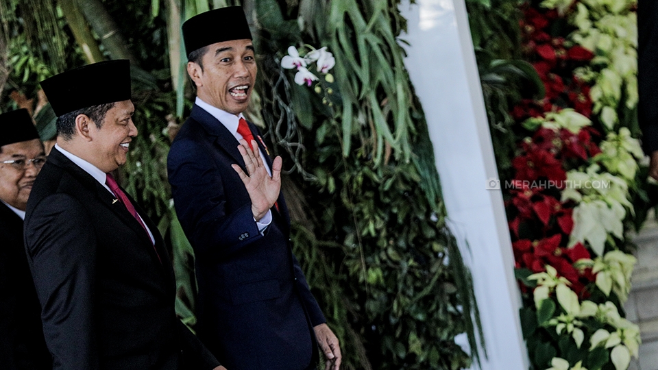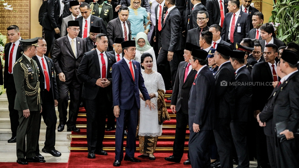 Presiden Joko Widodo didampingi Wakil Presiden Jusuf Kalla dan Ketua Majelis Pemusyawaratan Rakyat (MPR) Bambang Soesatyo tiba untuk mengikuti Pelantikan Presiden dan Wakil Presiden Republik Indonesia periode 2019-2024 di Gedung Paripurna, Komplek DPR MPR, Jakarta, (20/10/2019). Merahputih.com / Rizki Fitrianto