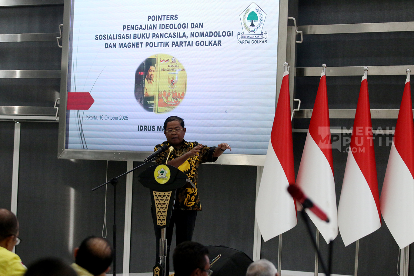 Merahputih.com - Wakil Ketua Umum Partai Golkar Idrus Marham (kanan) menyerahkan buku kepada Sekjen Partai Golkar Muhammad Sarmuji (kiri), disaksikan Pakar Kebangsaan Yudi Latif (kedua kiri) dan Pengamat Politik Siti Zuhro (kedua kanan) dalam Pengajian Ideologi Kebangsaan di Kantor DPP Partai Golkar, Jakarta, Kamis (16/10/2025).